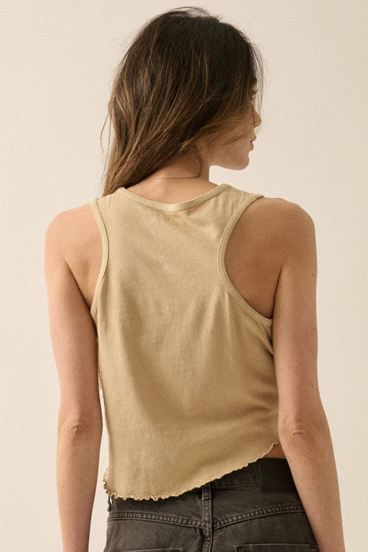 This mineral-washed tank top features a vintage camping graphic with the inspiring phrase "Adventures The World Awaits." Designed with a round neckline and sleeveless cut, it offers a relaxed fit and a cropped length. The curved hem is finished with a delicate lettuce-edge detail, making it a stylish and comfortable choice for your next adventure.