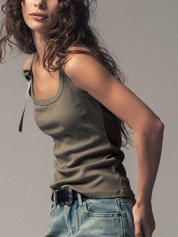 Elevate your wardrobe with our sophisticated ribbed knit tank top featuring a distinctive metal buckle strap detail. This eye-catching side accent adds an edgy touch to the classic silhouette, transforming a simple tank into a statement piece that demands attention. Perfect for creating stylish, head-turning looks that set you apart from the crowd.