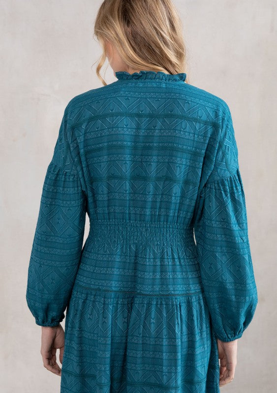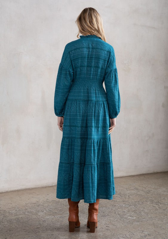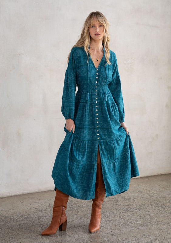This maxi peasant dress showcases a tiered design with flowing long sleeves and a flattering v-neckline. It includes a button-front closure, a split neckline adorned with tassel ties, and a delicate ruffled trim. The skirt features multiple tiers, complemented by a smocked elastic waist for a comfortable fit and intricate lattice detailing for added charm.