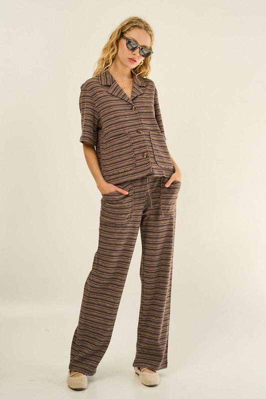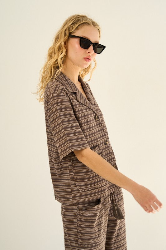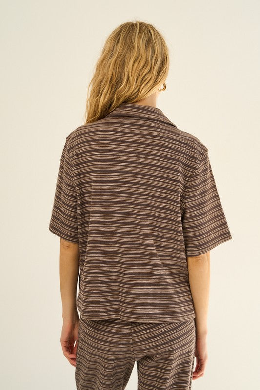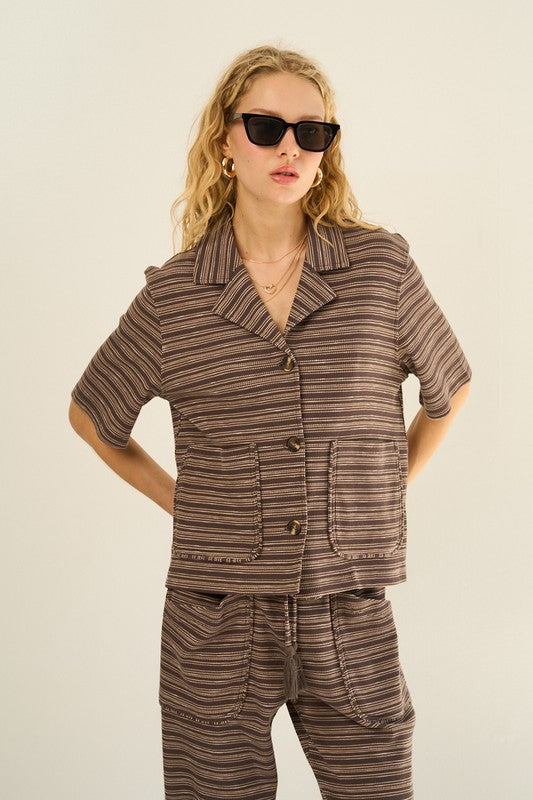 Our modern take on a classic silhouette, this striped knit short sleeve button down shirt is made from soft, breathable fabric that allows for all day comfort. The short sleeves , collar, and button down front adds a timeless look while the eye catching horizontal thin stripes elevate its classic vibe. It is also designed with two front pockets for added functionality.
