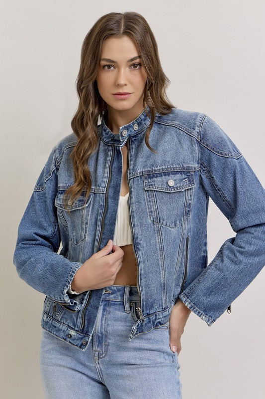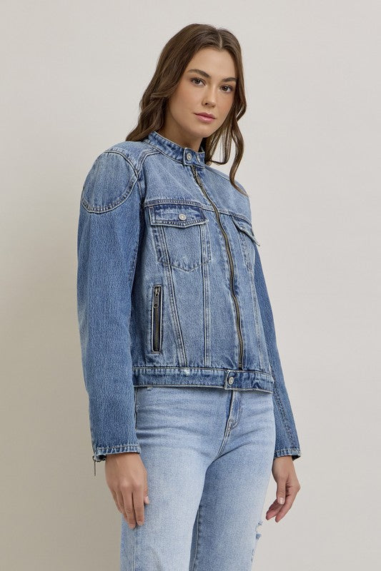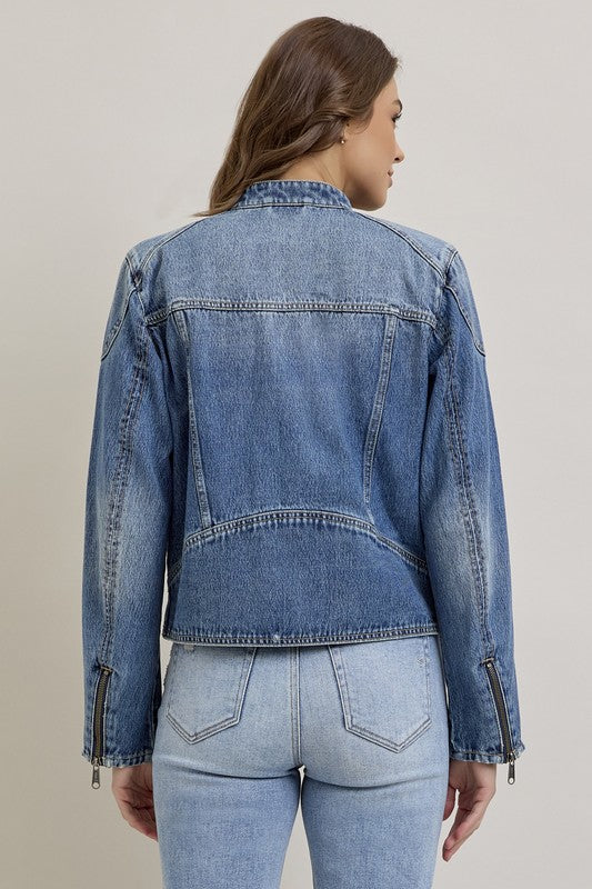 The legacy of the denim jacket never fades away. Add this medium wash classic Biker denim jacket to your closet.
