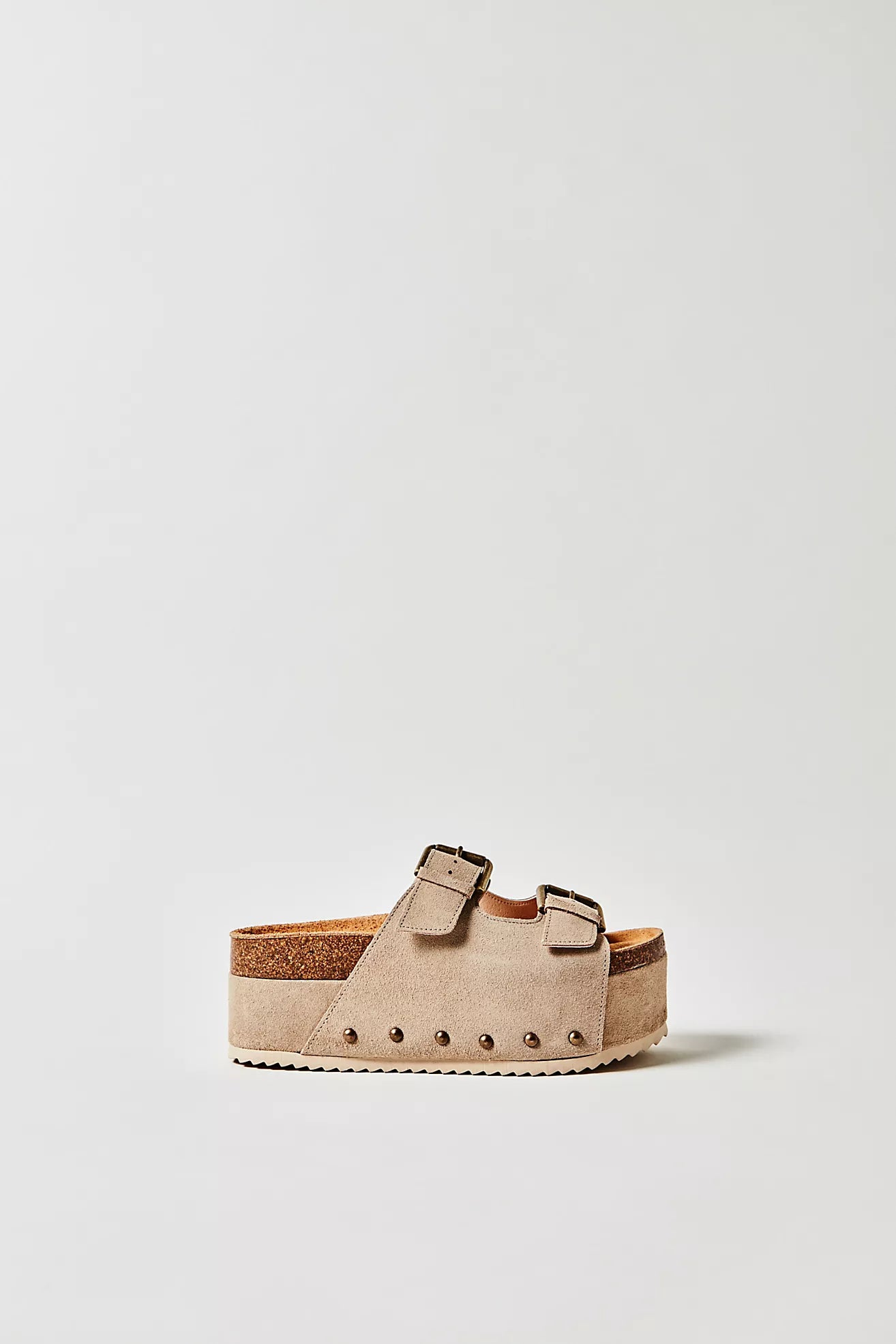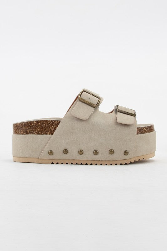 Turn heads in these so bold and statement-making sandals featured in a slip-on style and two-strap design with a chunky flatform sole, studded embellishments, and buckle detailing.