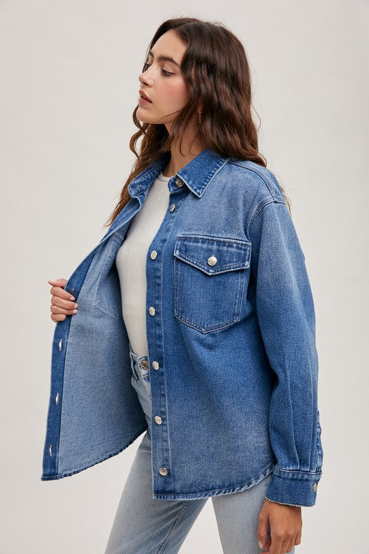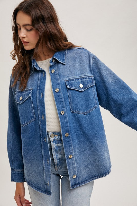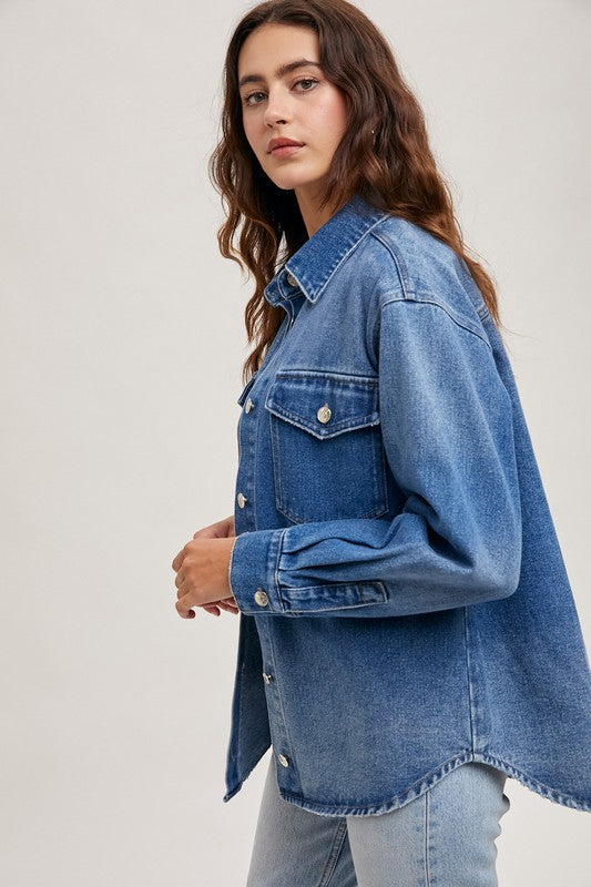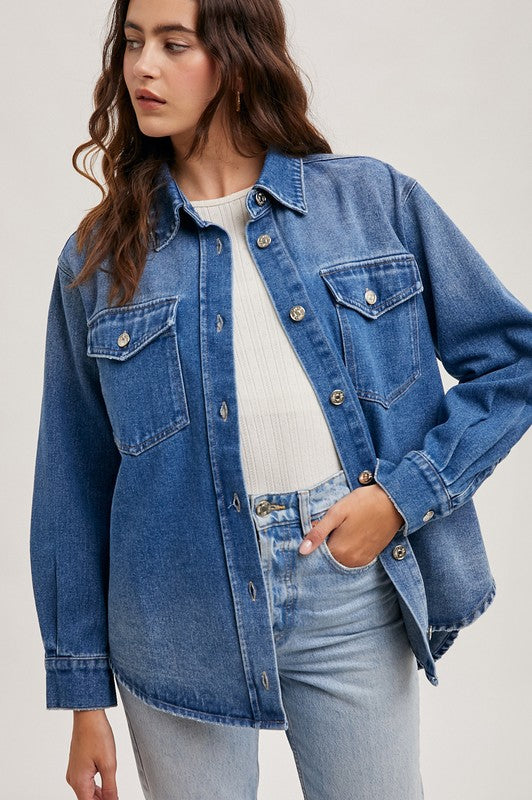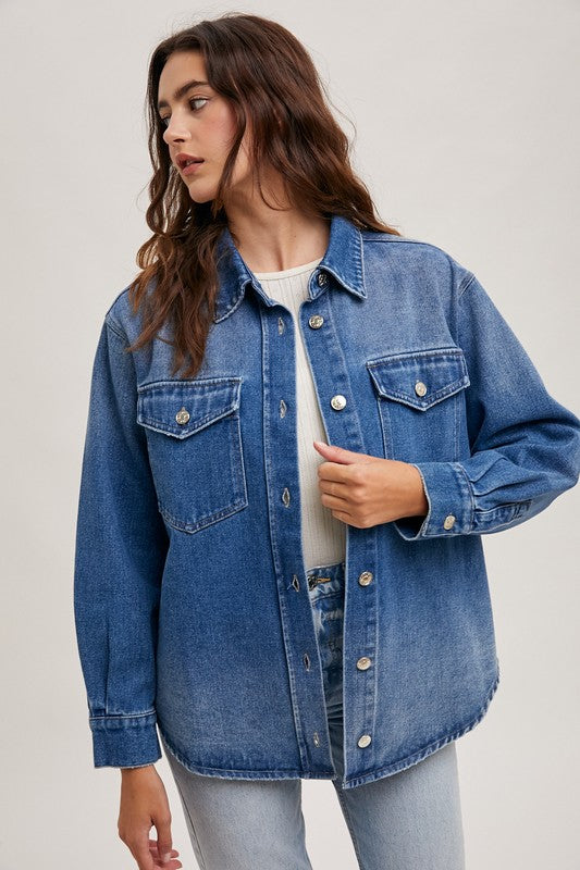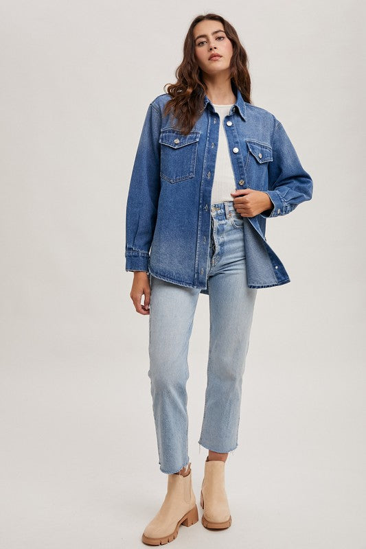 Washed denim button down shirt jacket. This casual yet stylish piece features a button-down front and is made from soft, washed denim for a comfortable fit. Its shirt jacket design offers versatility, allowing it to be worn as a shirt or layered as a jacket. Perfect for a laid-back, everyday look, this shirt jacket combines functionality and fashion effortlessly.