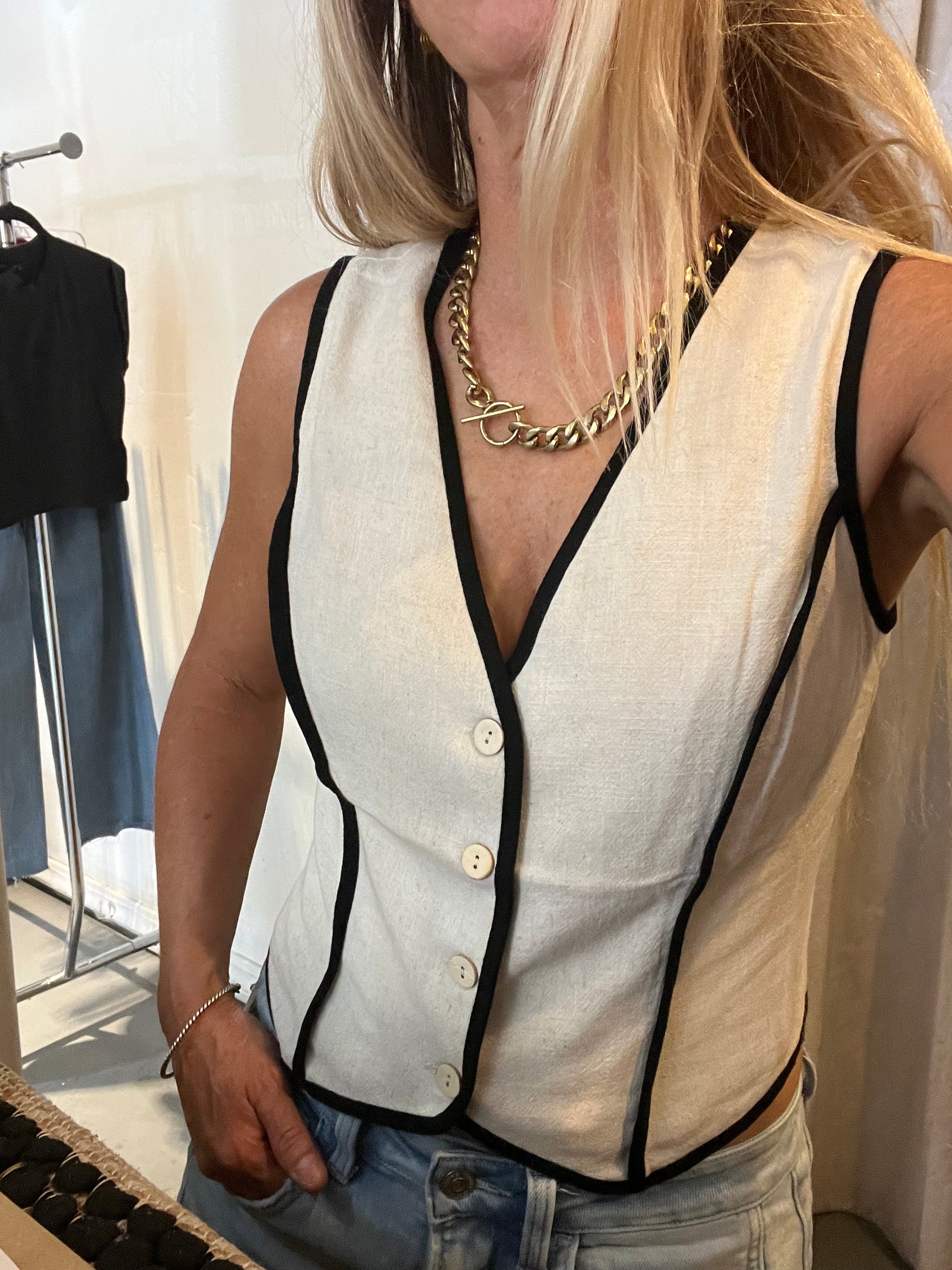 Elevate your wardrobe with the luxurious feel of linen fabric. The binding details and coconut button front add a touch of sophistication, while the pointed hem creates a modern look. Stay cool and stylish in this sleeveless vest.