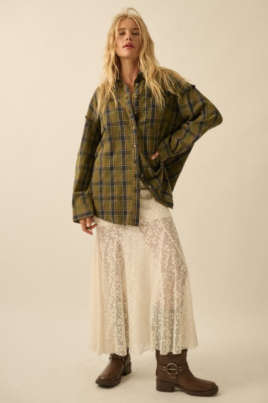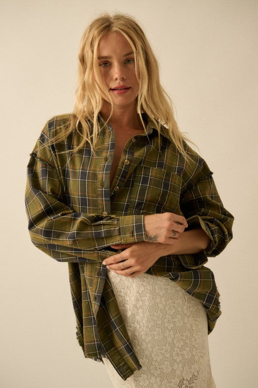 A woven plaid shirt with the following features: Collared neckline. Long sleeves with buttoned cuffs. Drop shoulder. Exposed shoulder seam with frayed raw edge. Button-front closure. Chest pocket. Pleated yoke back. Curved shirttail hem with frayed raw edge. Oversized fit.