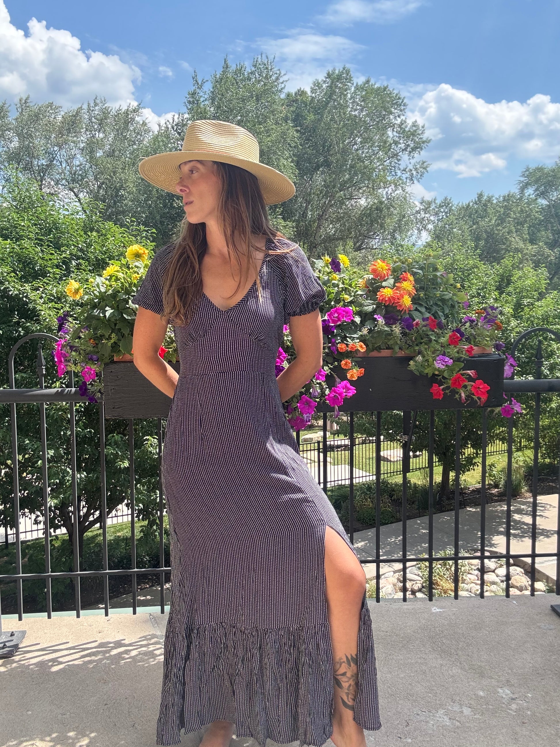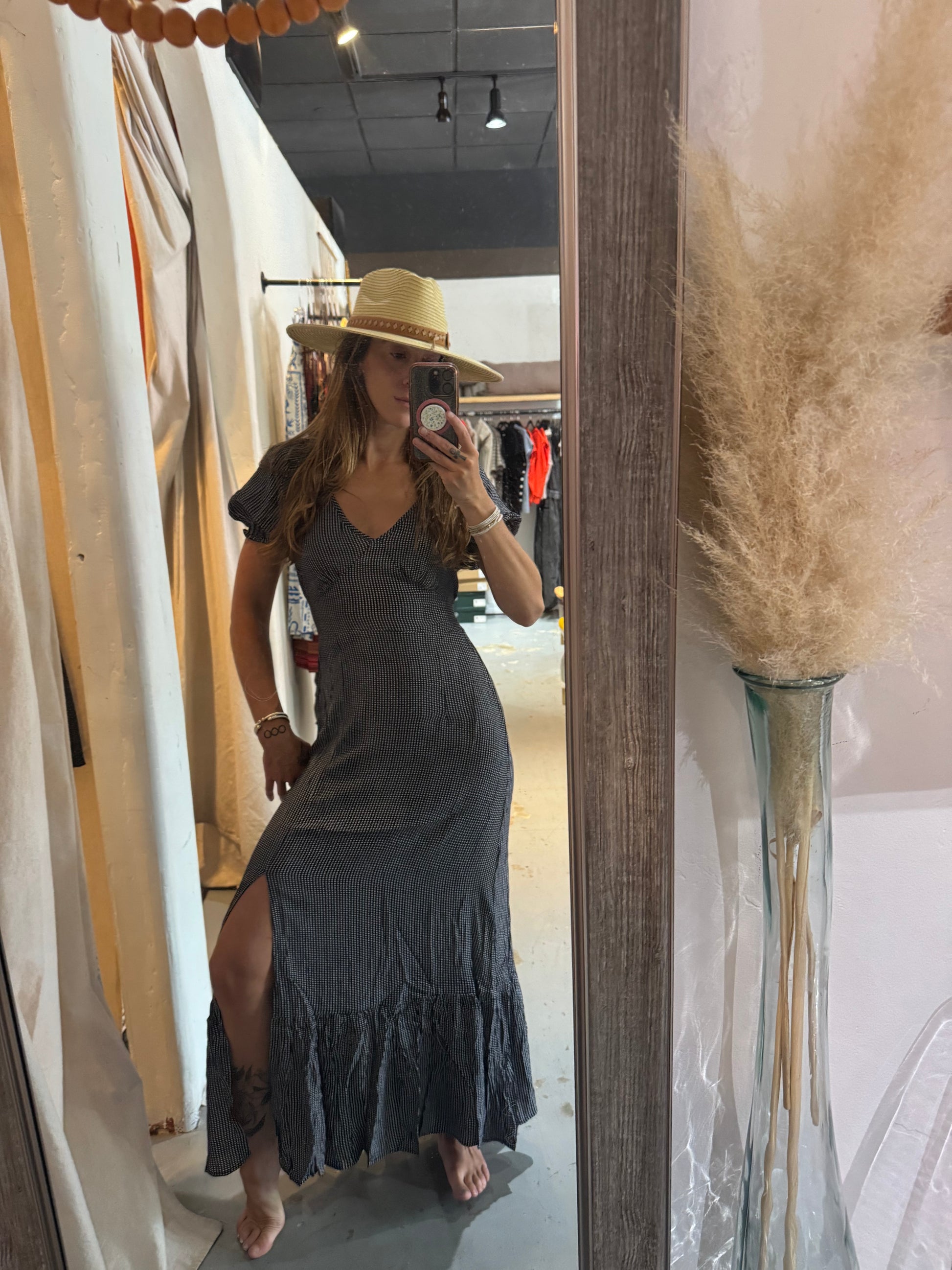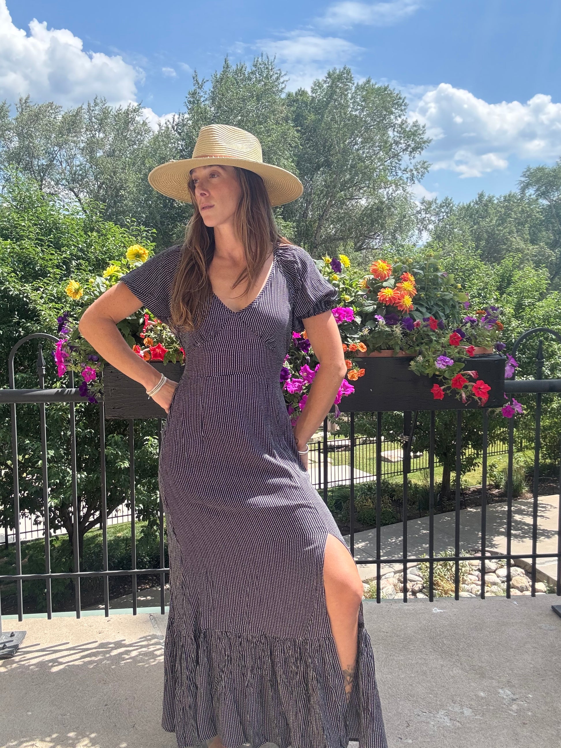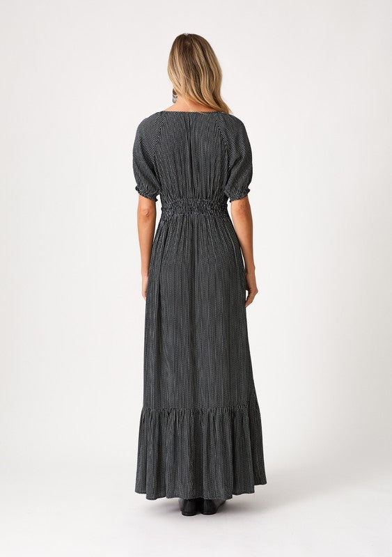This dotted maxi dress showcases a flattering v-neckline and charming short puff sleeves. It includes a smocked back for a comfortable fit, ruffled elastic cuffs, a front slit, and a hem adorned with delicate ruffles. Ideal for effortlessly transitioning from daytime outings to evening events.