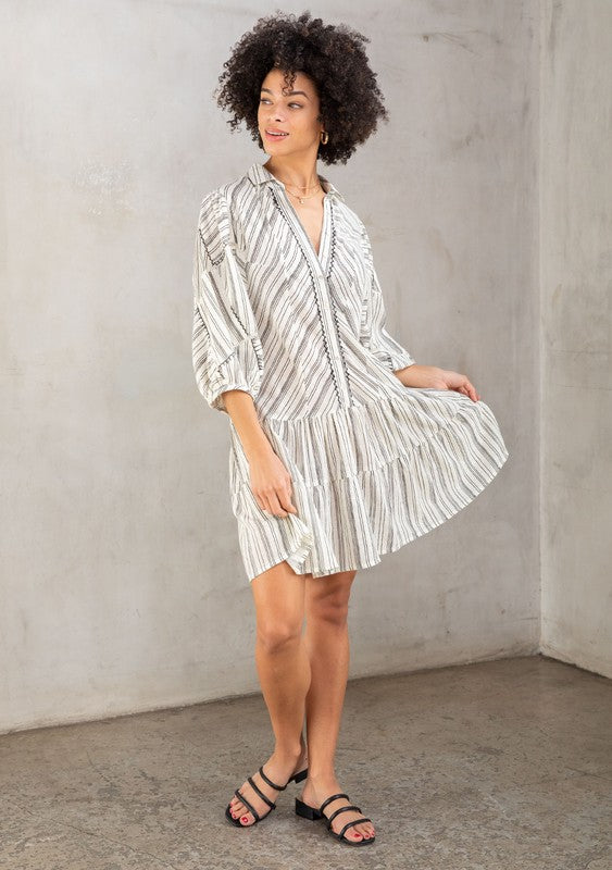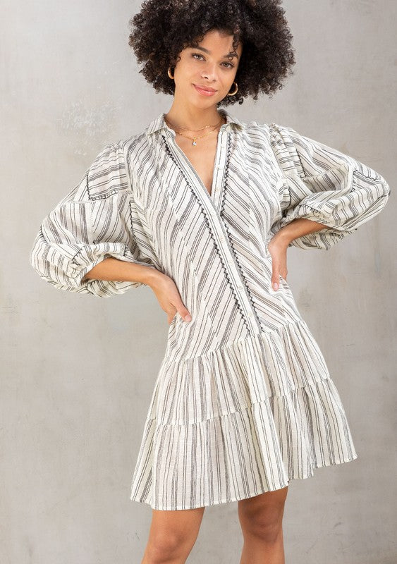 This stylish cotton slub yarn dye shirt dress combines casual comfort with elegant hand-stitched embroidery throughout. It features a classic collar, voluminous three-quarter sleeves, a button-down front, and a tiered skirt for added flair. The oversized silhouette offers a modern, relaxed fit, making it a must-have for effortless, on-trend dressing. Designed without lining for breathable wear.