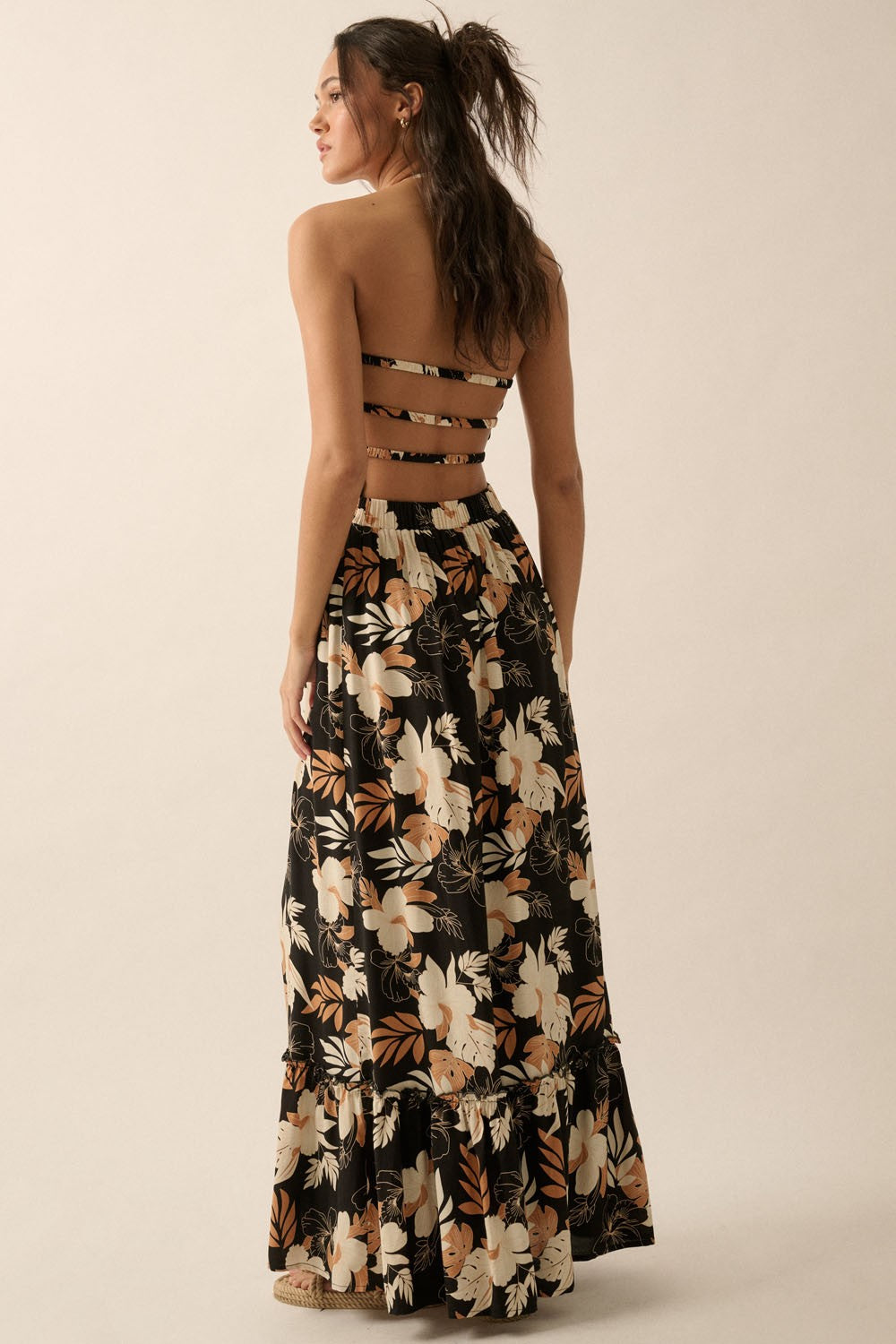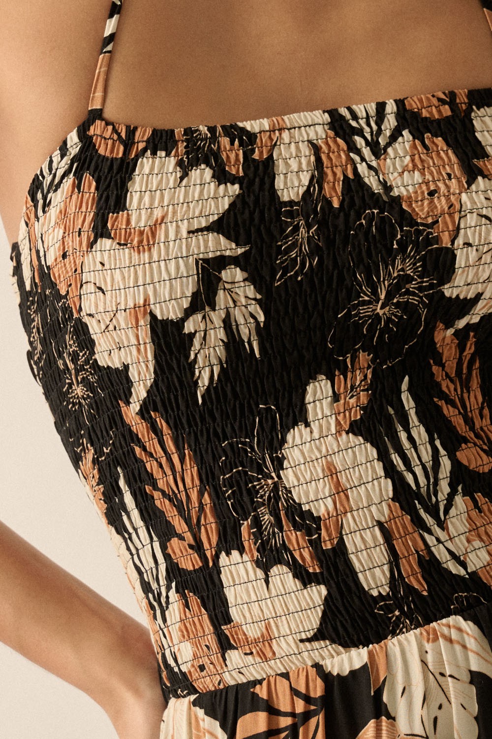 A floral print woven maxi dress with the following features: Halter neckline with self-tie closure. Smocked bodice. Sleeveless. Tiered, ruffle hem. Open back with elastic straps. Back elastic waist. Ankle length. Fit and flare.