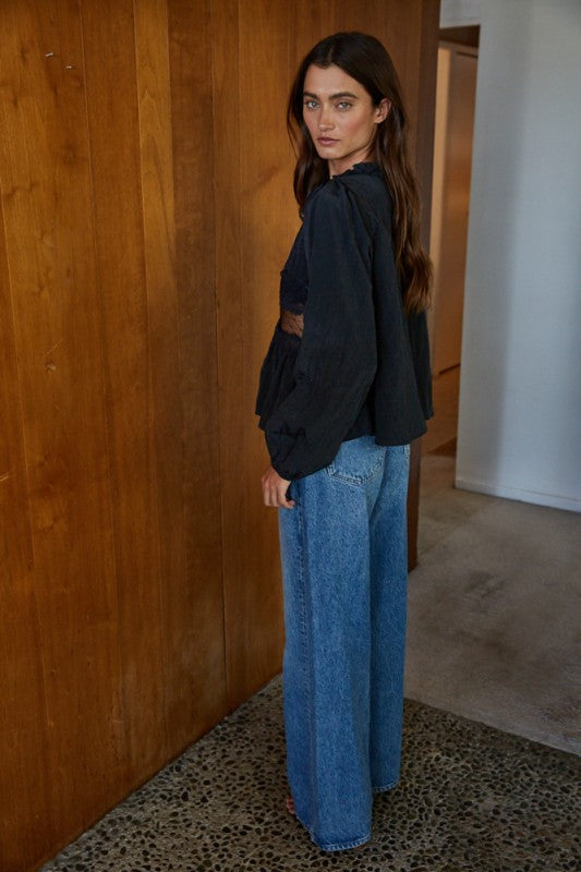 This blouse features a woven polyester nylon blend with delicate sheer + sexy lace accents. It combines a V-neck design with a ruffled, tied ribbon round neck, long sleeves, a front button closure, and a ruffled peplum for a feminine and elegant look.