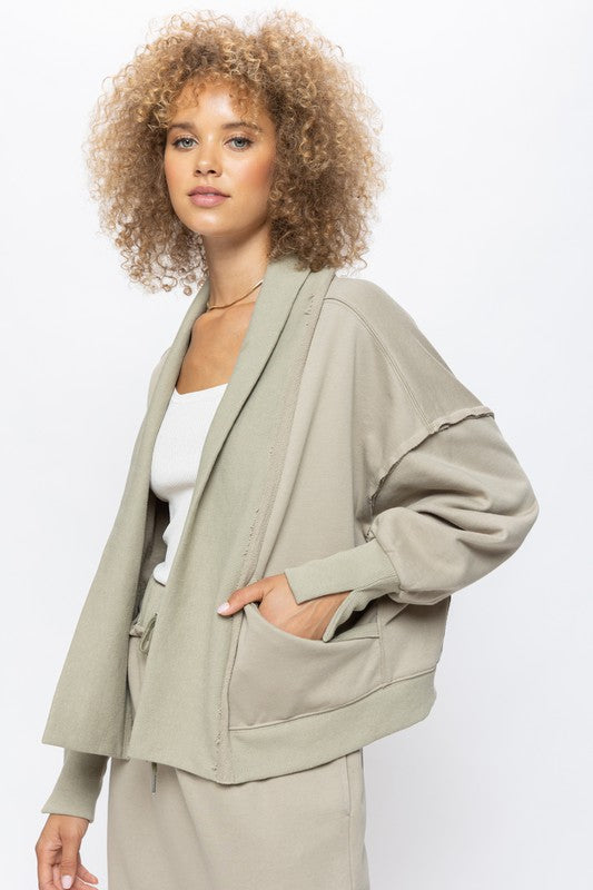 Features: Soft cotton fabrication, dropped sleeves with elasticated slit cuffs, ribbed hems, raw edge detailing