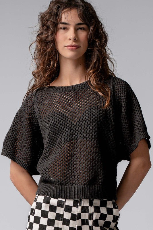 Effortlessly stylish top with open-knit mesh design, relaxed dolman sleeves, and ribbed hem. Versatile for pairing with linen pants, denim, or skirts. Light and airy for warm-weather wear.