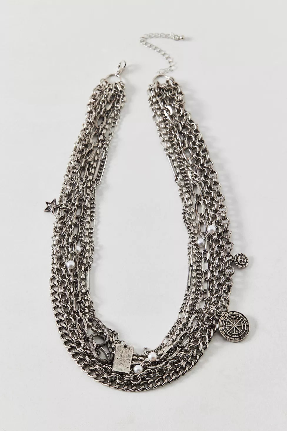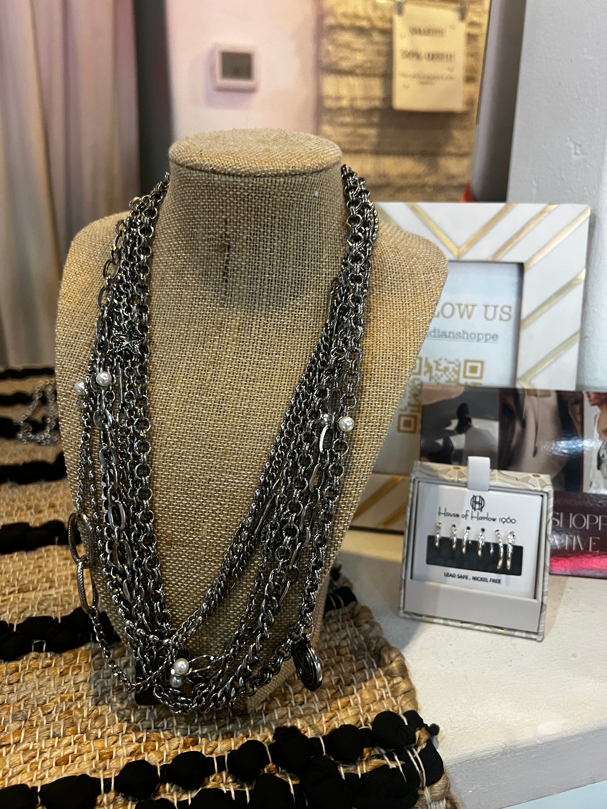 The ultimate multi silver chain + charms necklace. Elevate any basic with this one clasp statement piece that is easy to wear.
