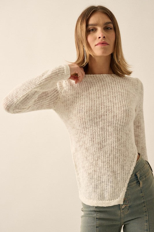 A solid ribbed knit sweater with the following features: Round neckline. Long sleeves. Asymmetrical side-slit. Rolled collar and cuffs. Fitted silhouette.