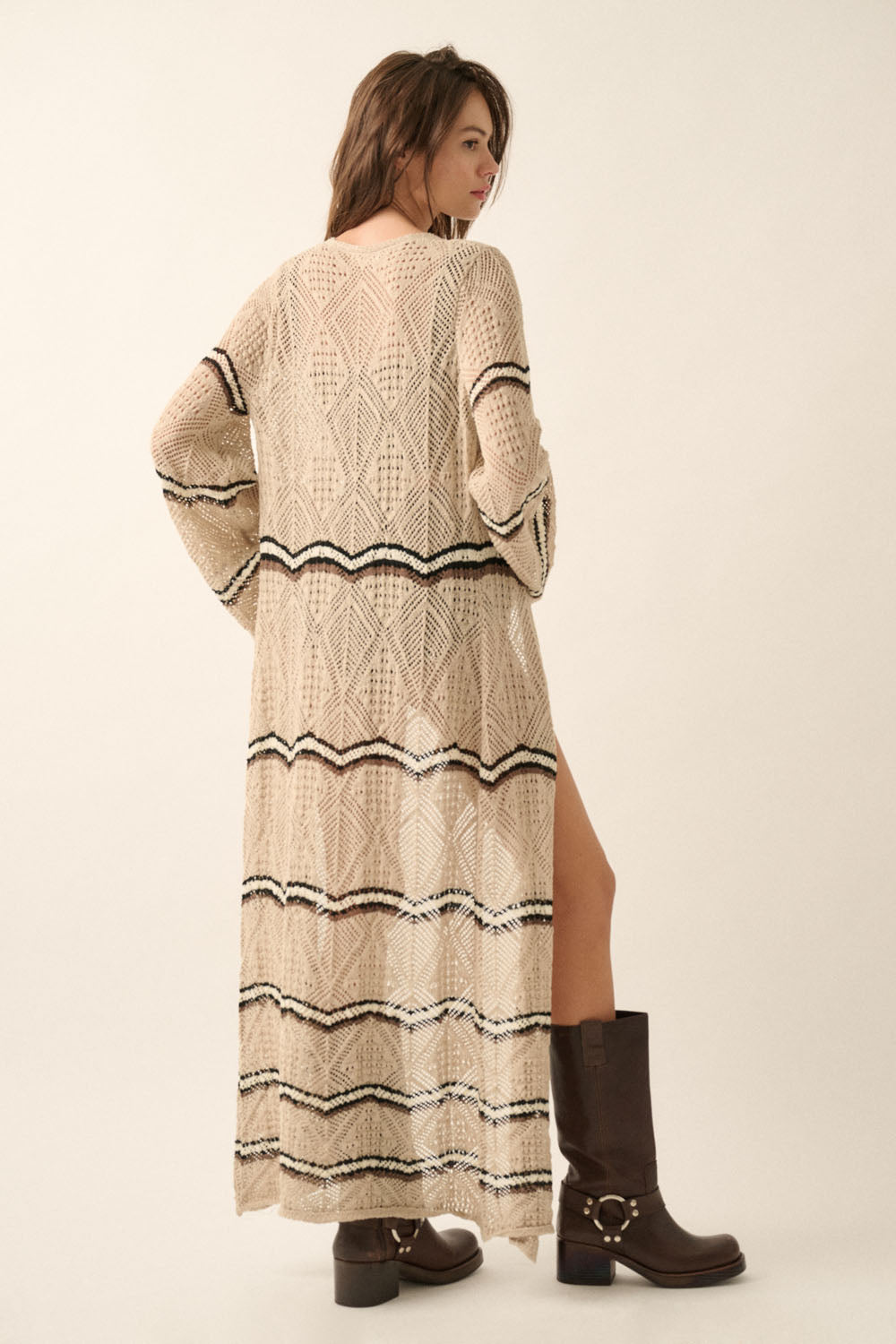 A striped crochet knit duster + kimono with endless styling options. Longline cardigan with the following features: Modern color scheme knit pattern. Open front with tie closure. Long bell sleeves. Ankle length. Relaxed fit.