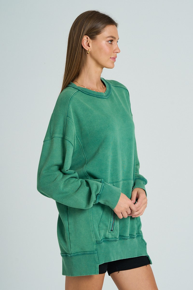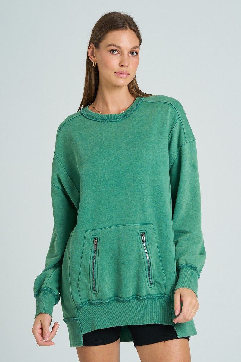 With its distinctive washed blue and washed green color, this oversized fit hoodie adds a streetwear vibe to plain hoodies. The functional front zippers open to the front pockets, while the asymmetrical front bottom sweep opening adds a cool look. The stitching around the collar adds contrast to the fabric providing a stylish flair. Perfect with a pair of biker shorts for a casual look or under jackets as a layered piece, it is a great addition to any wardrobe.