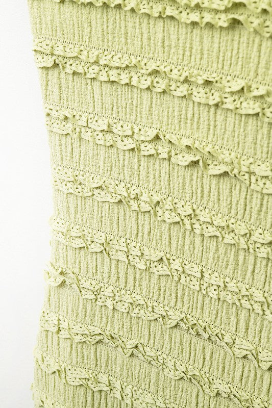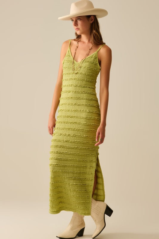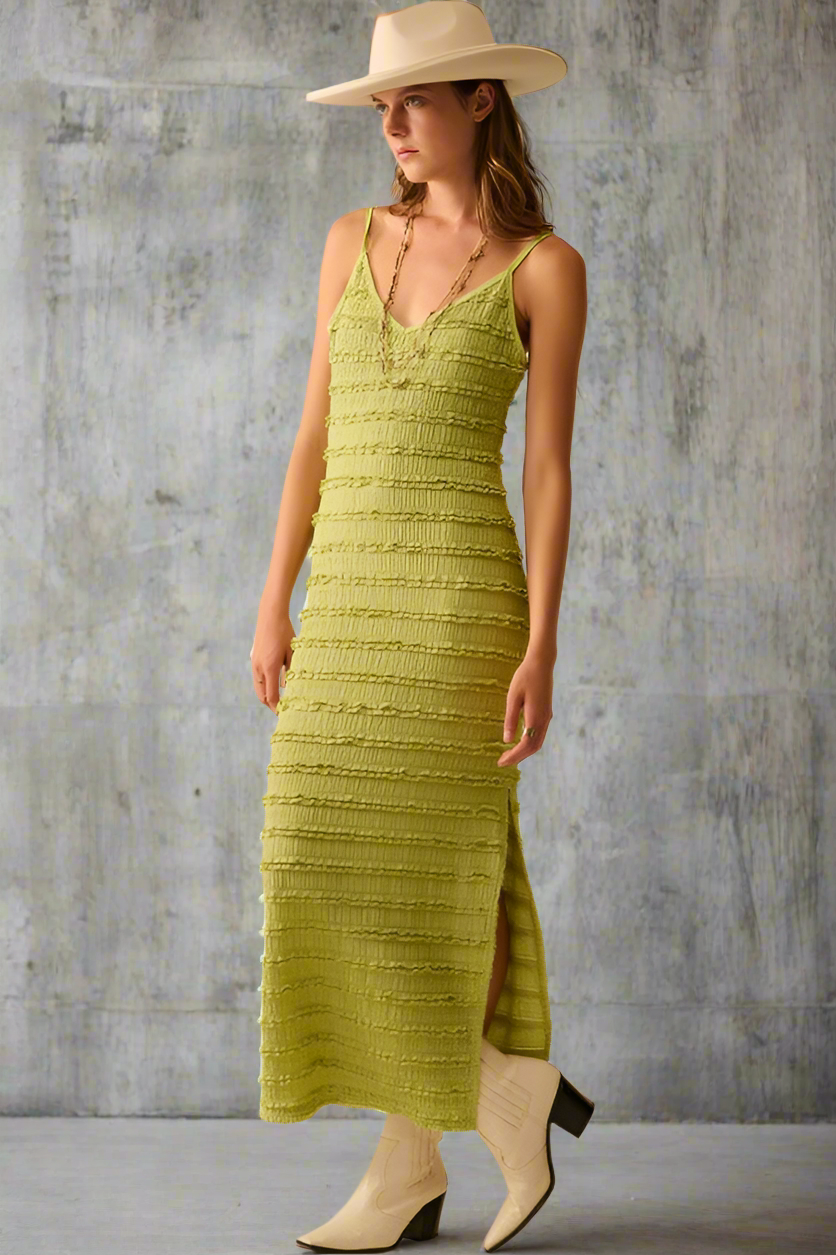 This Kiwi Maxi Dress features a flattering ruffle design and a stylish slit, offering a comfortable and elegant fit that enhances your silhouette effortlessly.