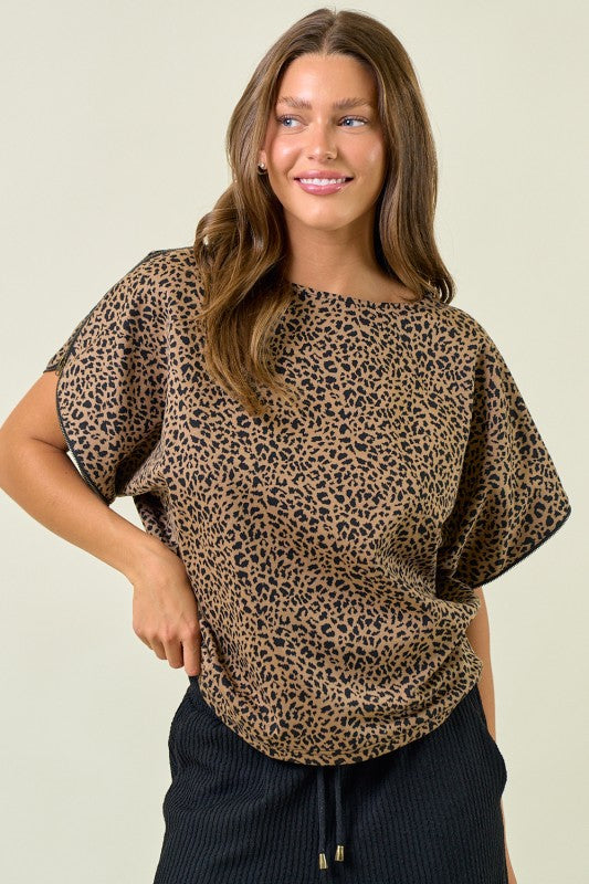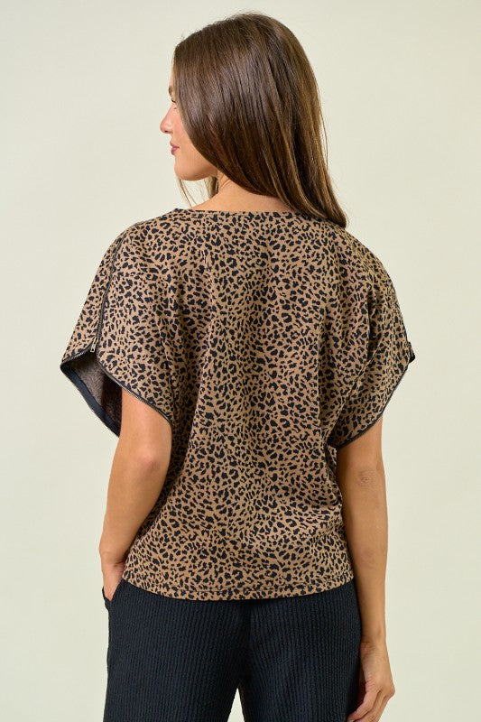 This animal print jacquard knit top combines bold style with comfort. Its relaxed fit and wide neckline make layering easy, while short sleeves with zipper openings add a stylish, versatile touch.