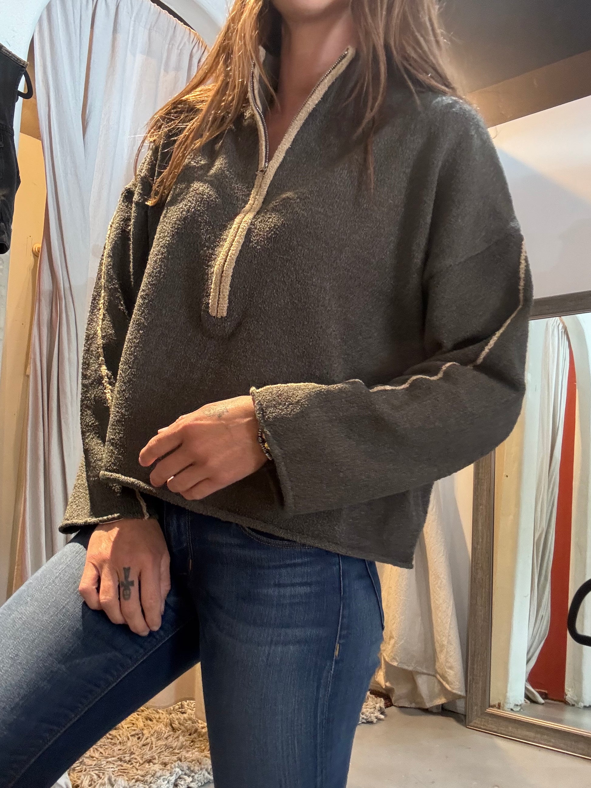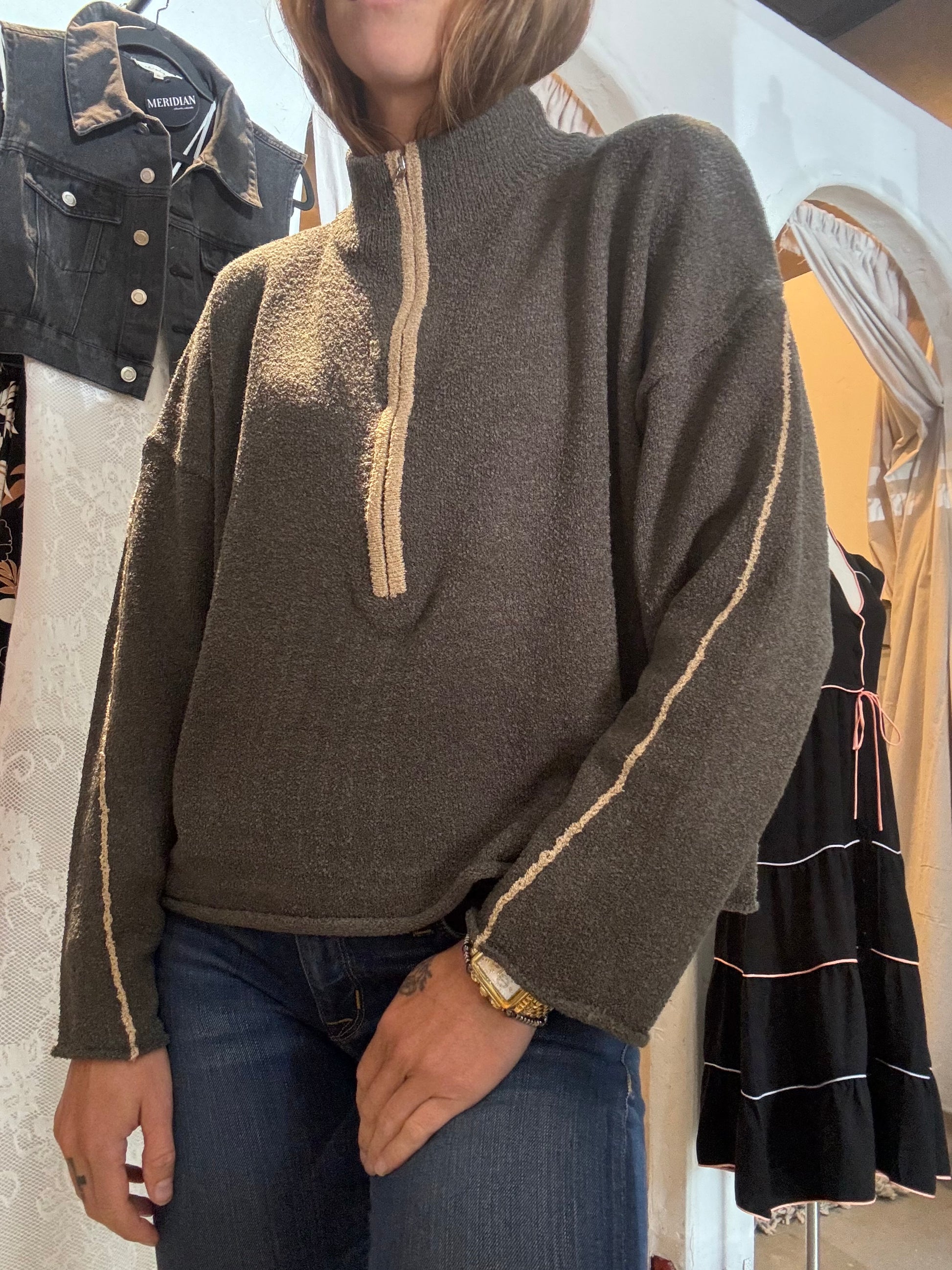 A solid, textured knit sweater with the following features: High mock neckline. Half-zip front closure in contrasting color. Long sleeves with contrast stripe. Drop shoulder. Ribbed knit collar. Rolled cuffs and hem. Loose fit.