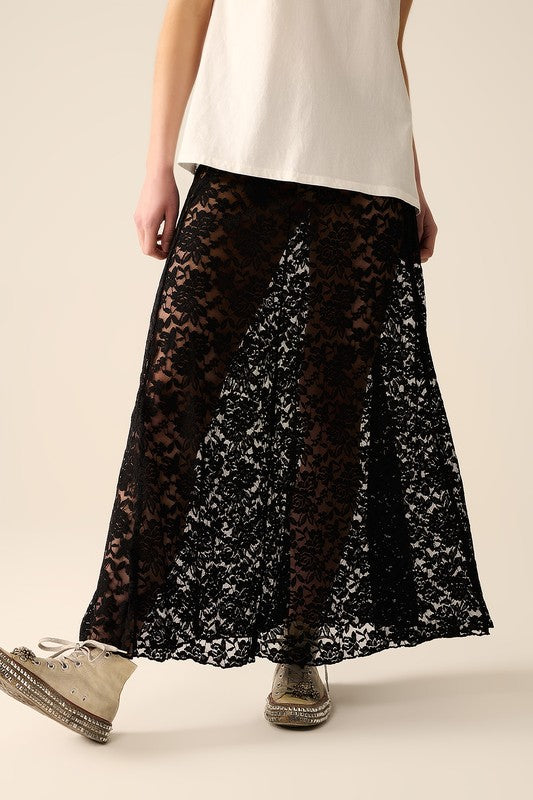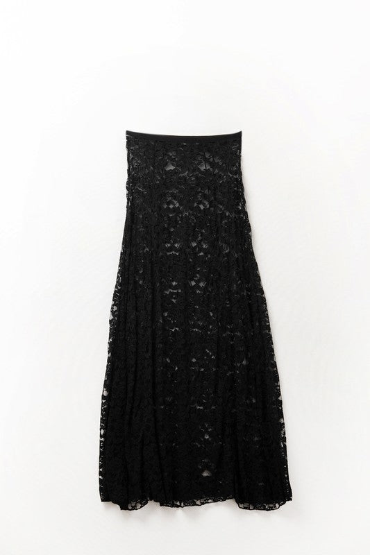 Introducing our fashionable black lace long skirt designed in a flattering A-line silhouette that enhances your shape. Crafted from a lightweight fluid fabric this skirt moves gracefully with every step providing both comfort and style. The intricate lace detailing adds a touch of elegance making it perfect for both casual outings and special occasions. Pair it with a simple top and your favorite accessories for a complete look!