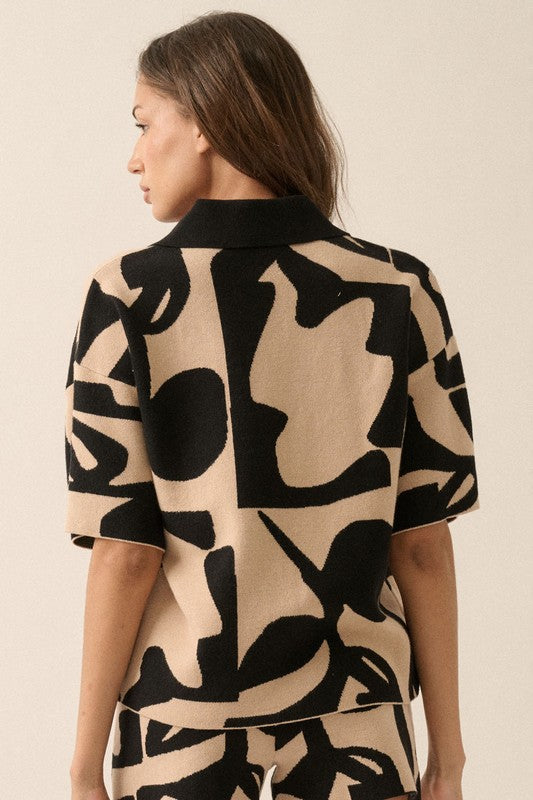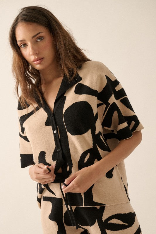 A pattern-knit sweater shirt with the following features: Abstract floral pattern. Lapel collar neckline. Button-front closure. Short sleeves. Drop shoulder. Relaxed fit.