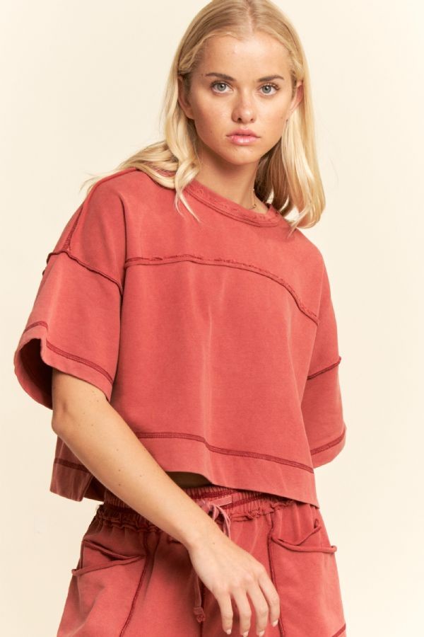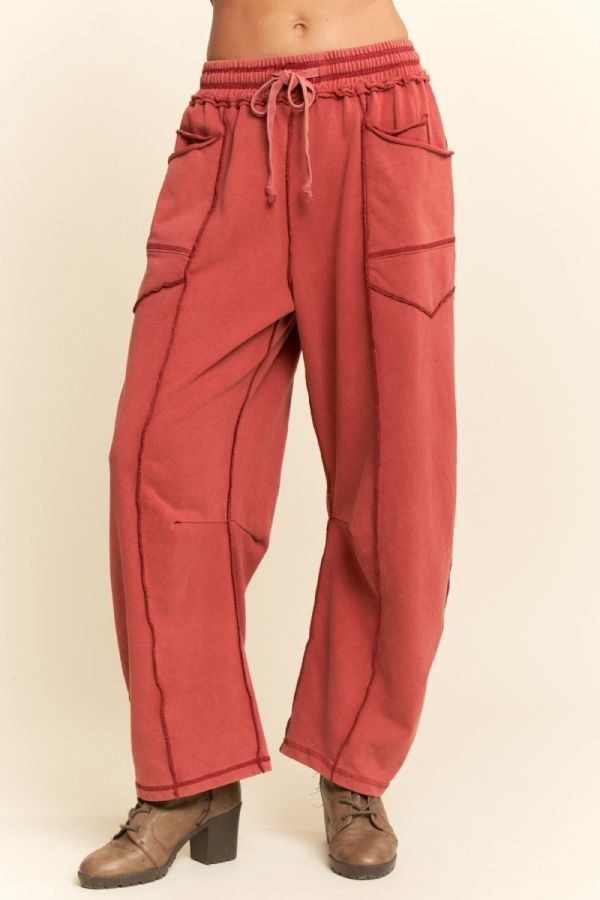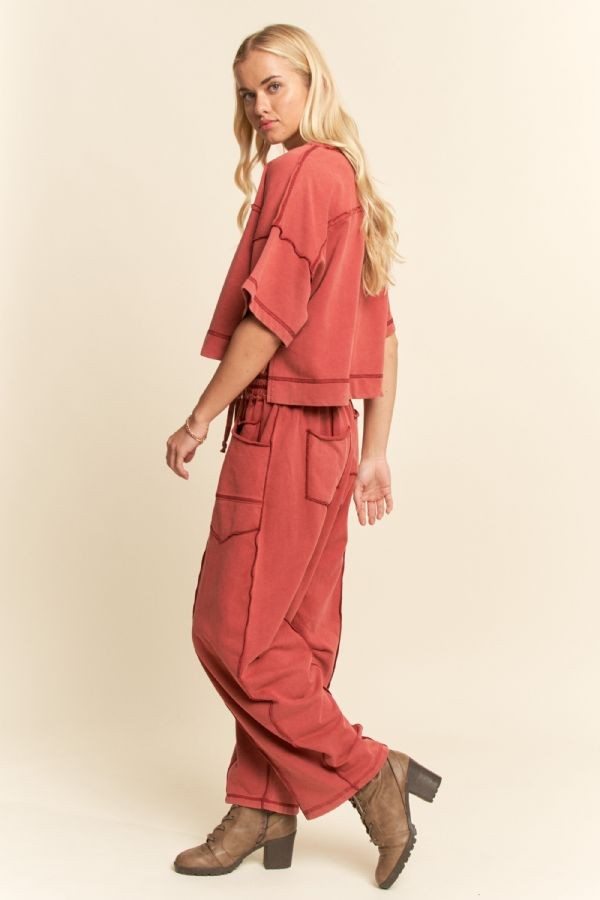 Elevate casualwear with this mineral washed two-piece set, featuring a relaxed boxy top and barrel pants with exposed seam detail. The elastic drawstring waist and oversized cargo pockets bring comfort and function, while the washed finish adds a lived-in, boutique-ready edge. A versatile lounge-to-street look that is effortless for layering or standout styling.