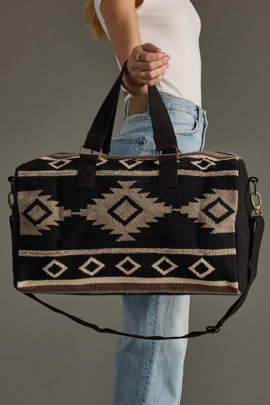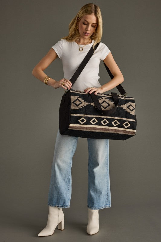 This stylish Western Aztec weekender bag features a black, taupe, and cream color scheme. It includes a secure zipper closure, an interior zipper pocket, and two additional small open pockets for organization.