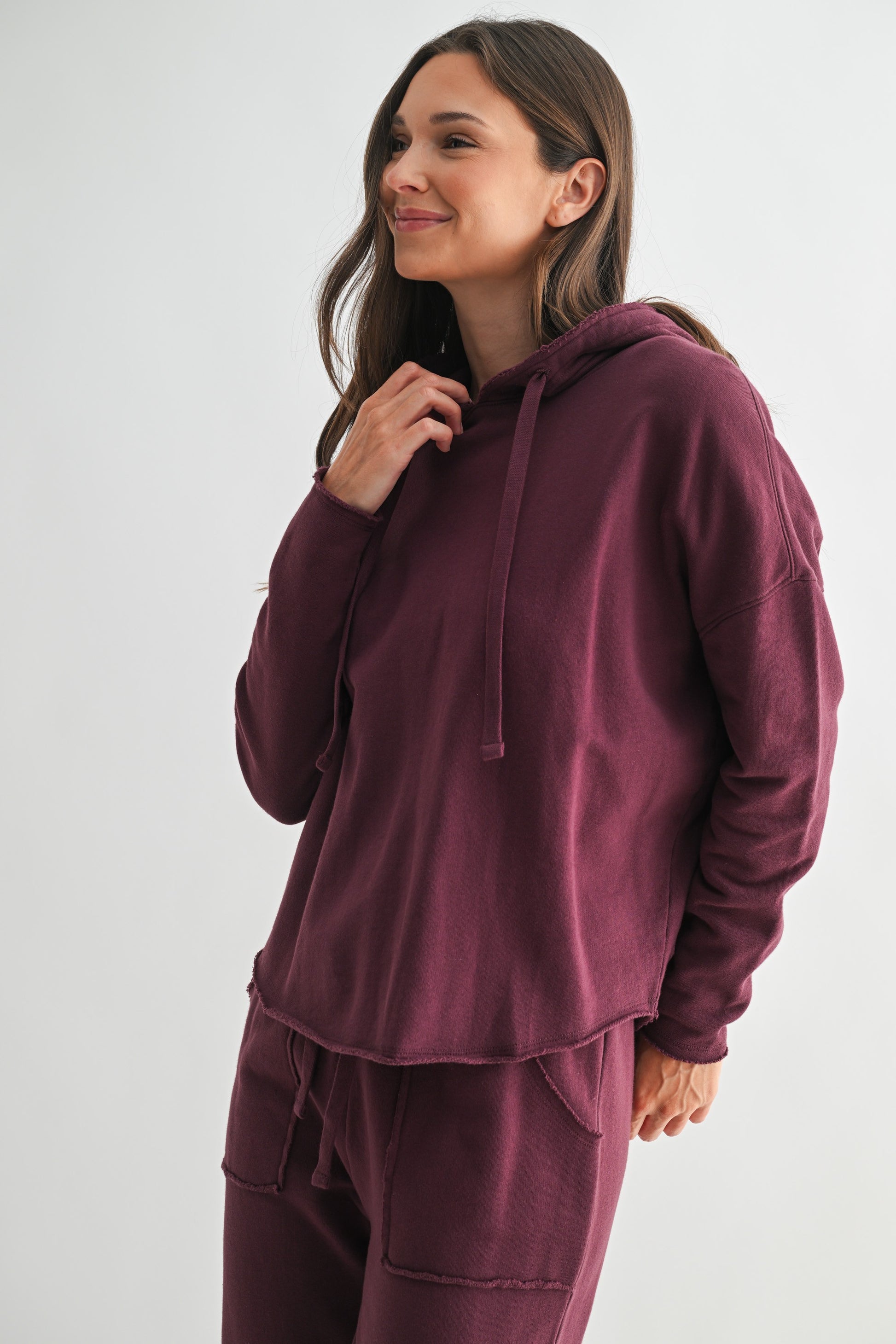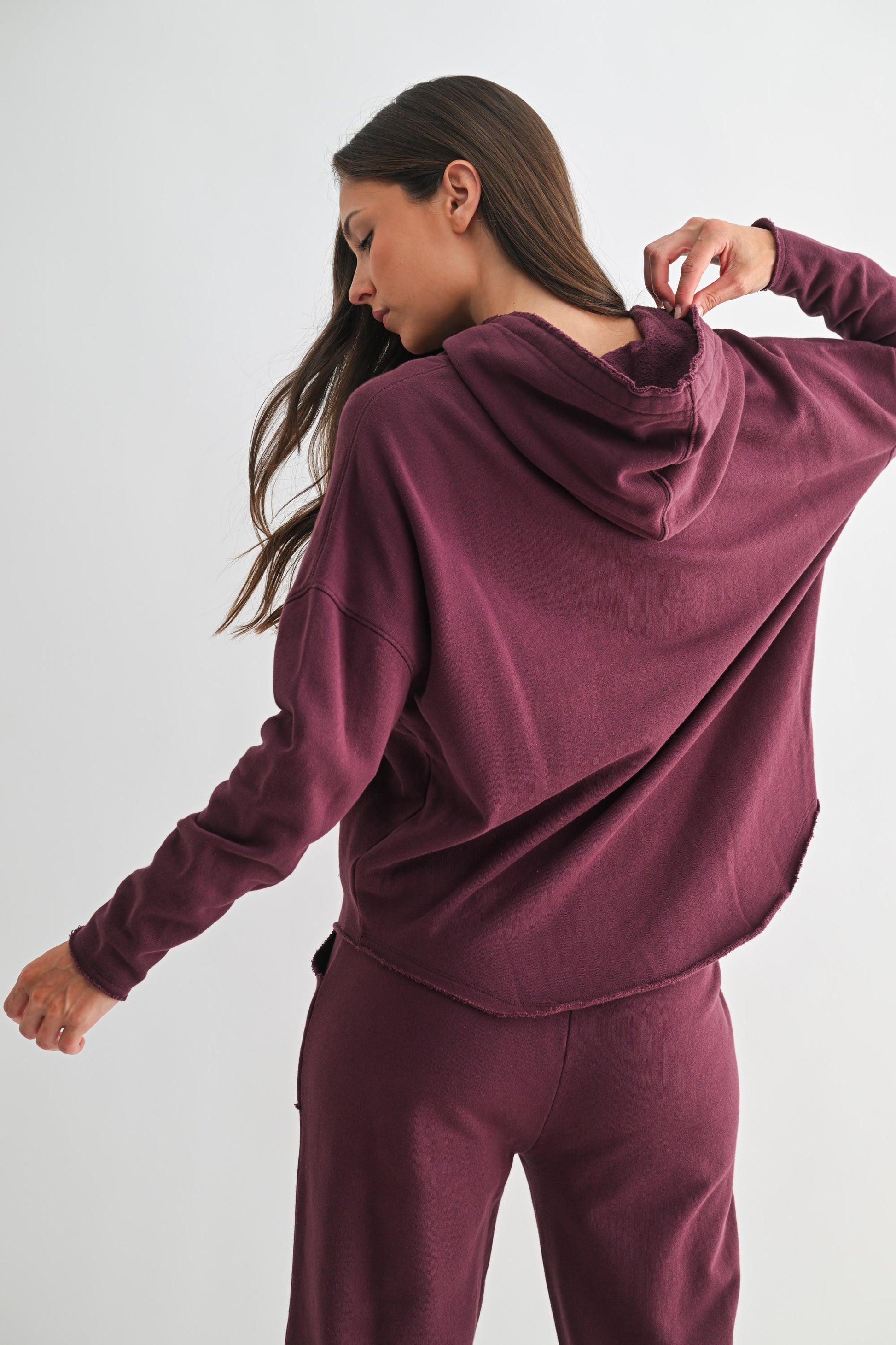 Dark plum, loose-fit hoodie sweater made from durable 100% cotton for warmth and comfort. Features a big drawcord and raw-edge hem for a loved, worn-in vibe. Garment-washed for a uniquely soft feel. Perfect for errands, post-gym, or casual everyday wear!