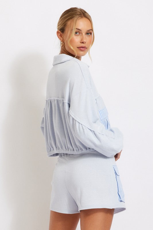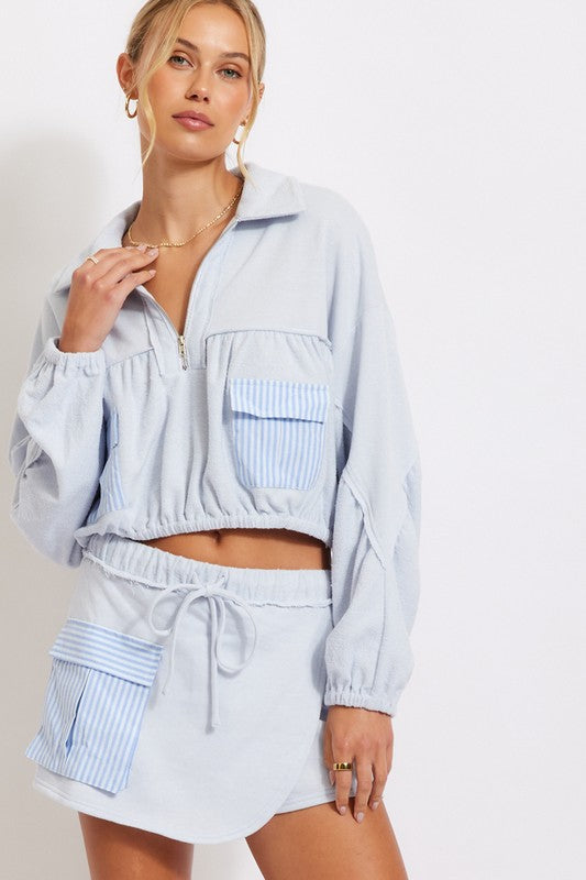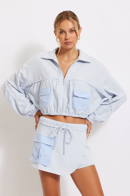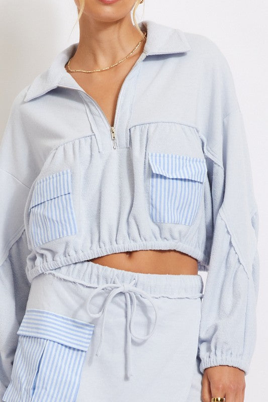 Features soft cotton terry fabric with striped patch pockets and a half zip. Its balloon sleeves with elastic cuffs and dropped shoulders add a stylish touch, while raw edge details and a collar complete the look. Comfortable and trendy for everyday wear.