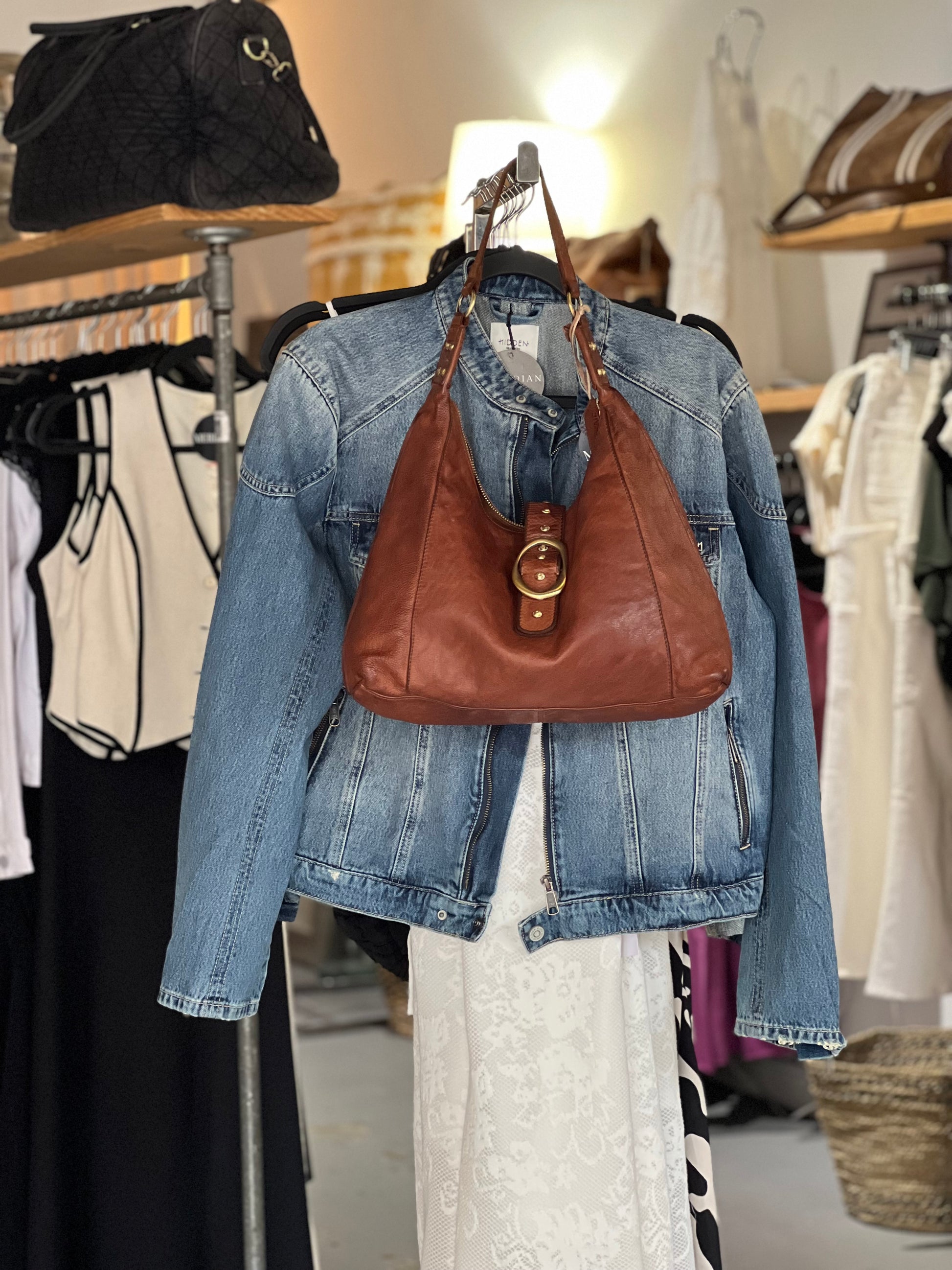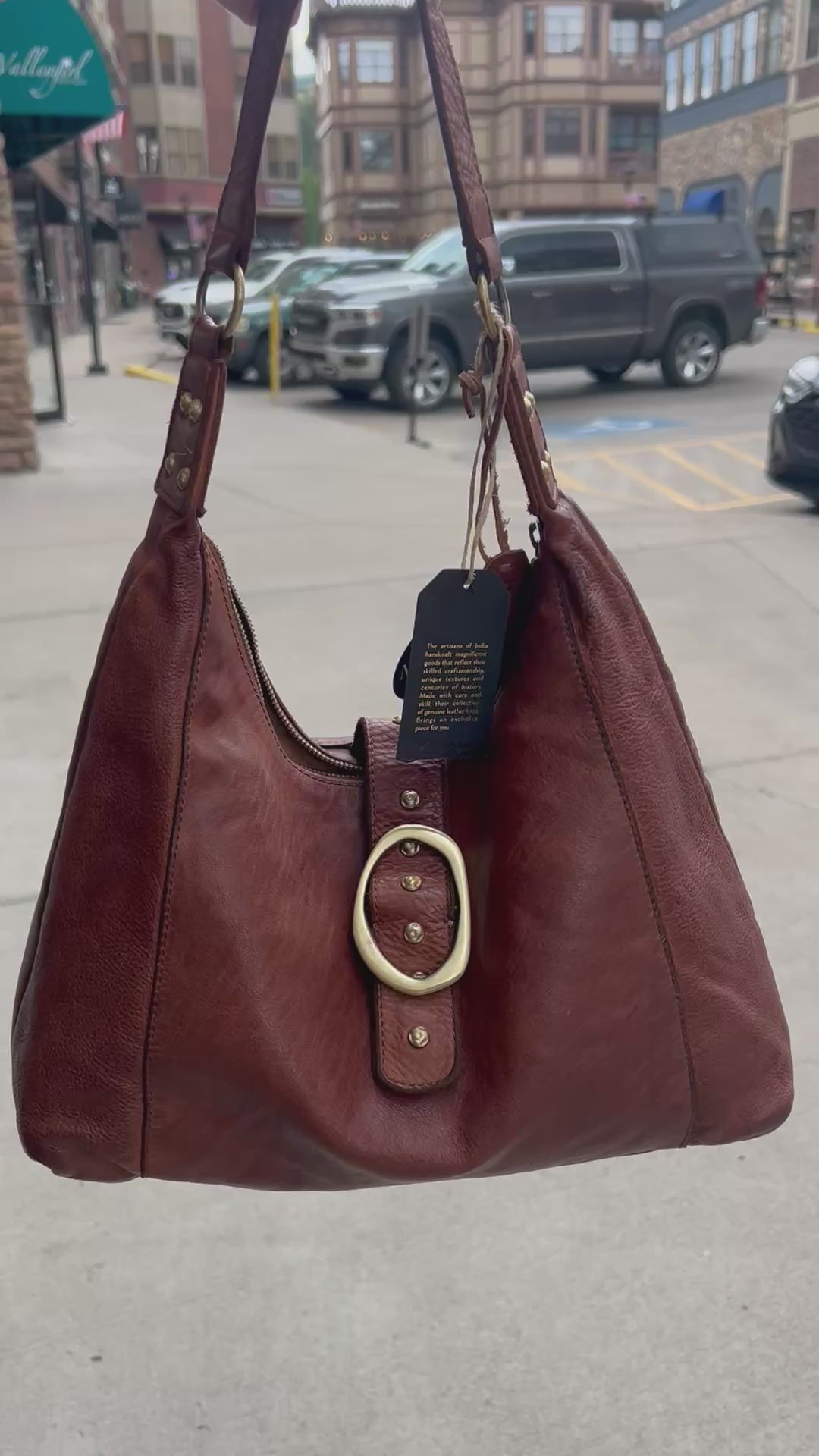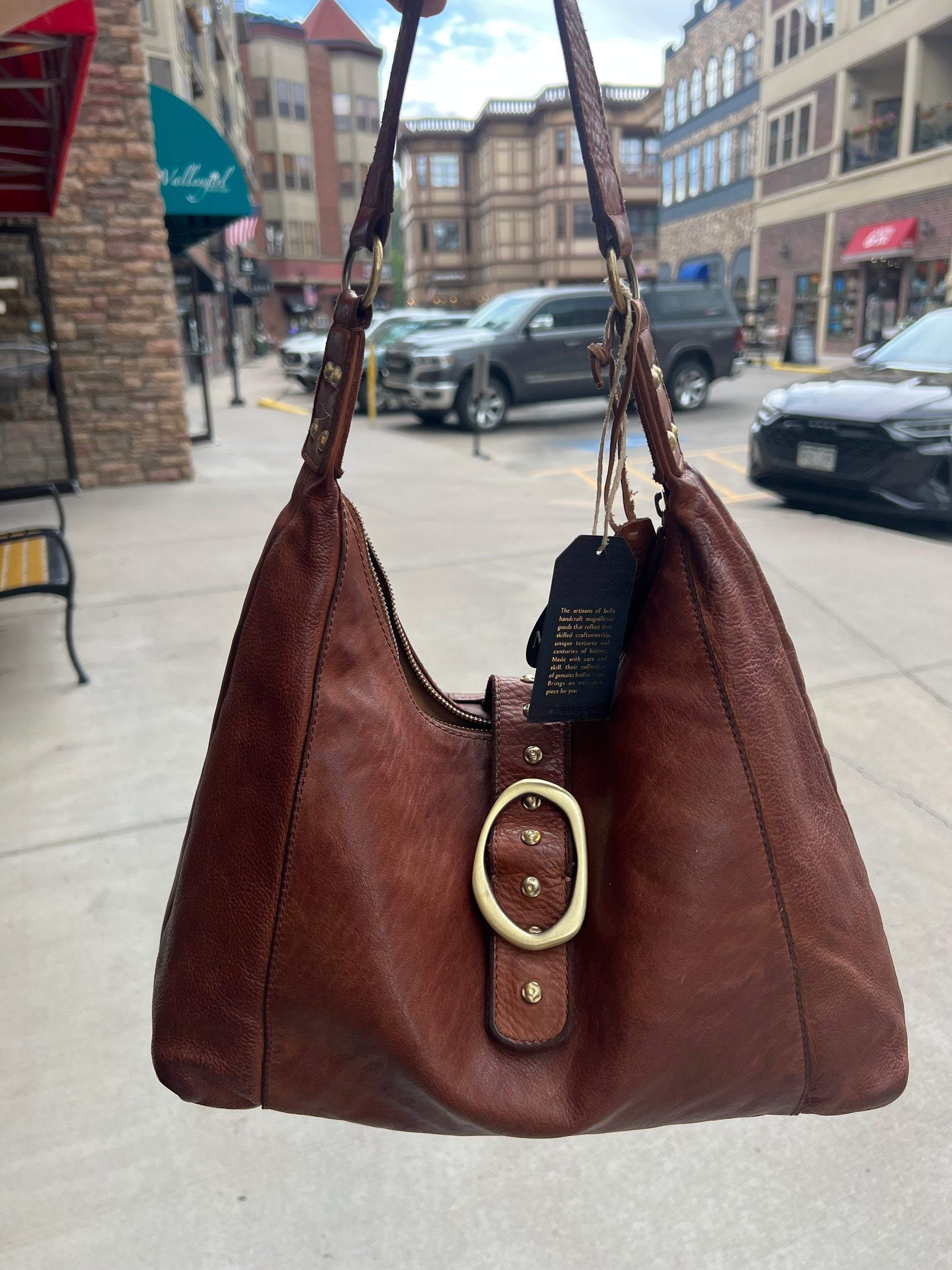 Genuine leather shoulder handbag. With brass buckle closure and brass accents.