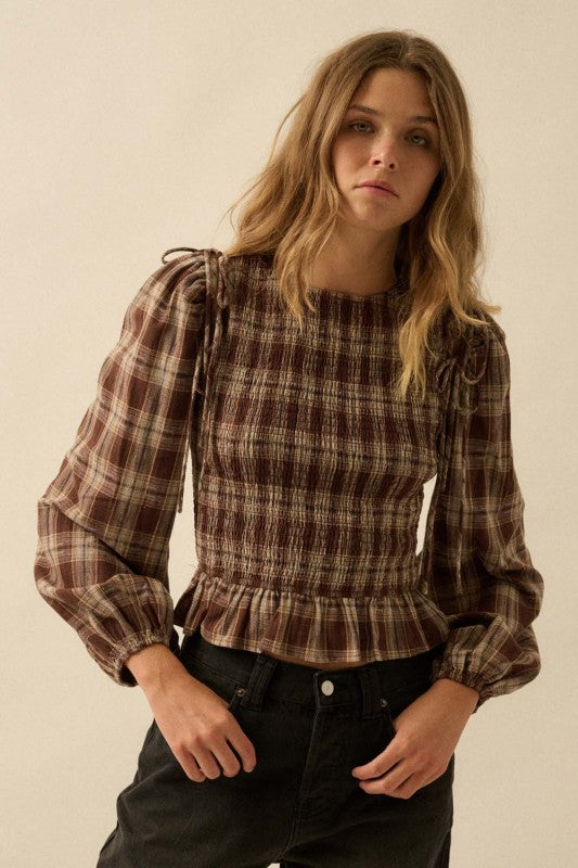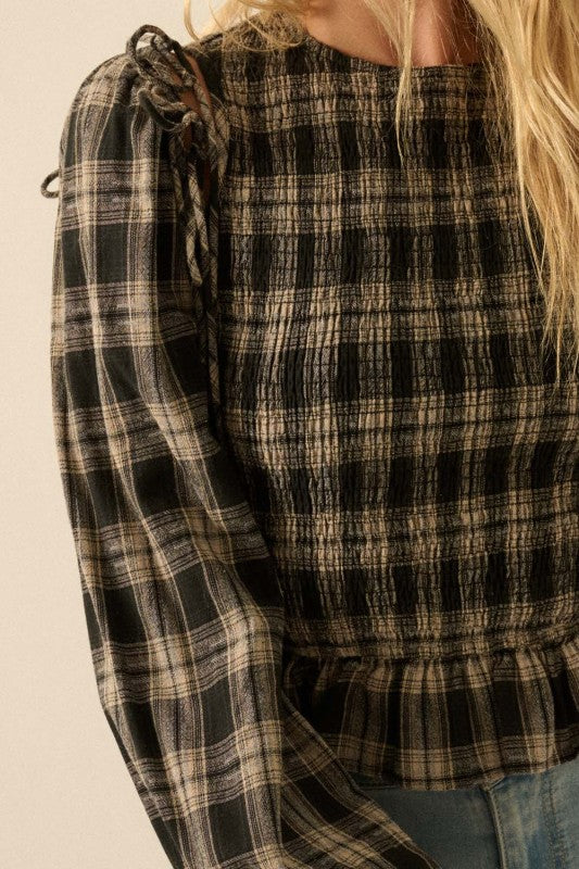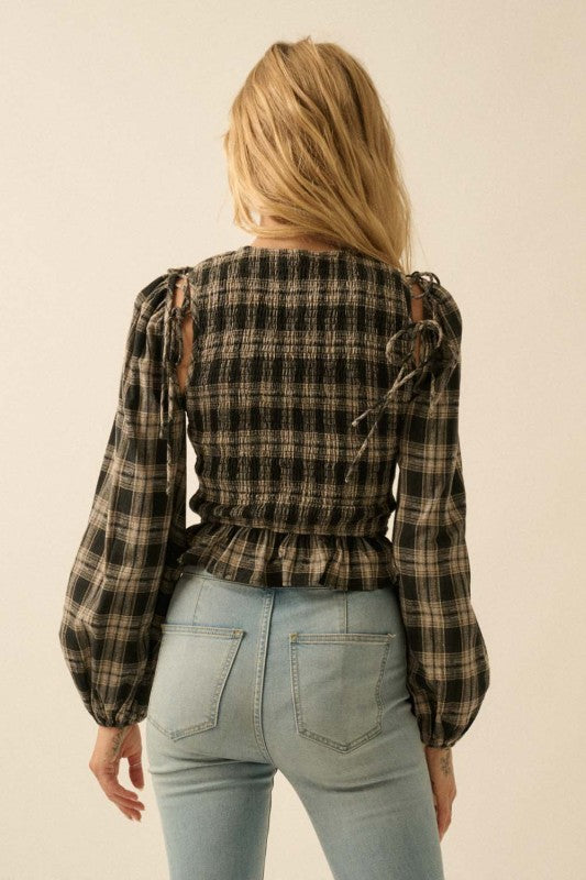 This plaid flannel top offers a high round neckline and a smocked bodice for a comfortable fit. It features long balloon sleeves with elastic cuffs, stylish shoulder cutouts secured with tie closures, and a ruffle peplum hem. With its cropped length and tailored silhouette, it delivers a flattering and fashionable look.