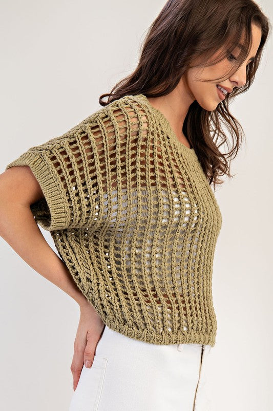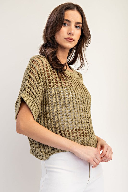 This airy crochet fisherman knit sweater features ribbed trims and loose sleeves, offering both comfort and style. Its open-knit pattern and cropped length make it an ideal piece for layering effortlessly.