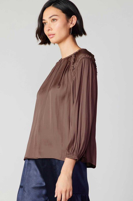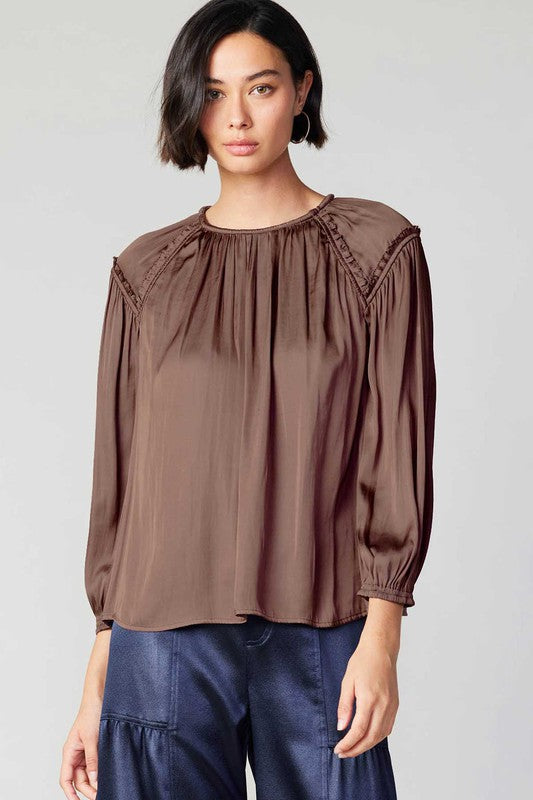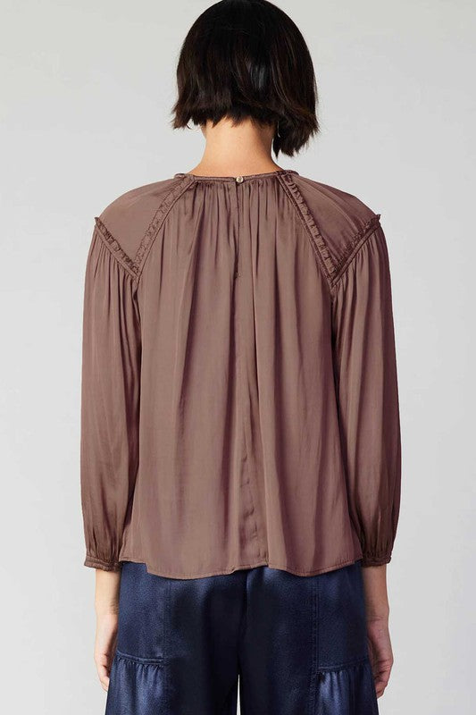 This elegant blouse features a round neck and long sleeves, with a delicate ruffle detail. The fabric is made of 100% polyester.