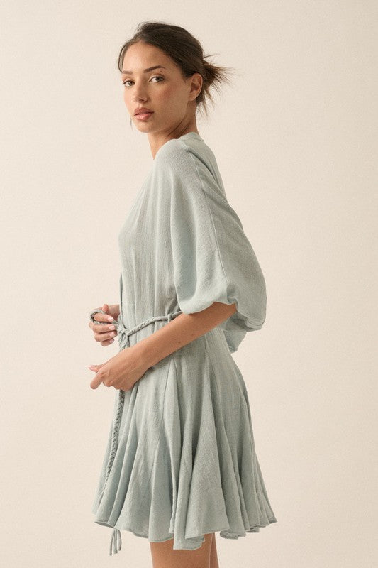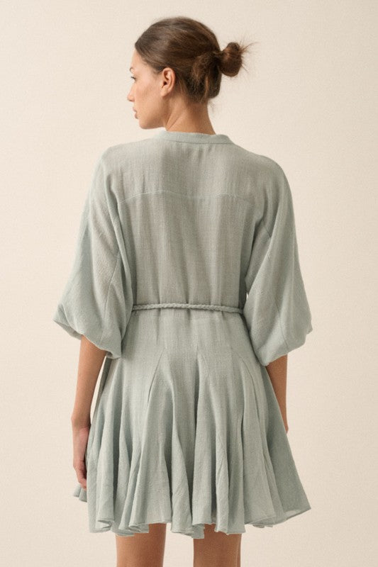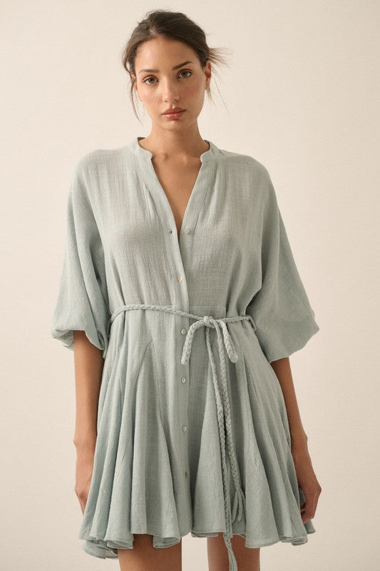 This mini dress is crafted from natural textured cotton for a comfortable feel. It features a collarless V-neckline and a button-front with elegant pearly buttons. The short kimono-style bubble sleeves add a stylish touch, while the removable braided tie belt defines your waist. The flared skirt with godet pleats and partial lining offers movement and coverage, falling to thigh length in a relaxed fit that’s perfect for any occasion.