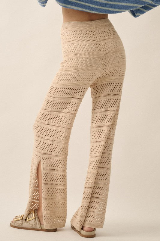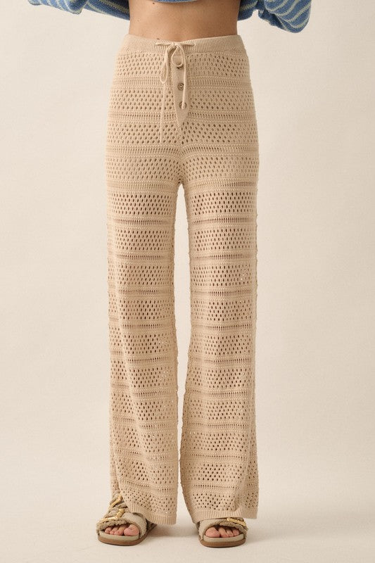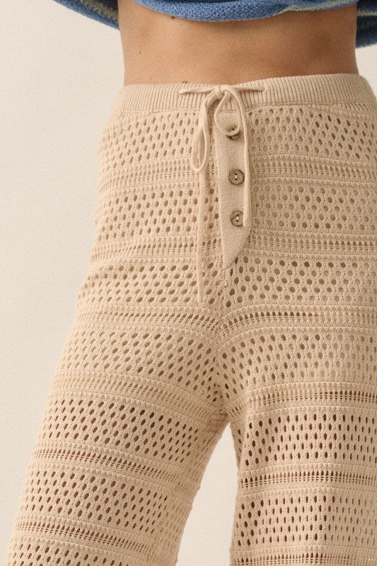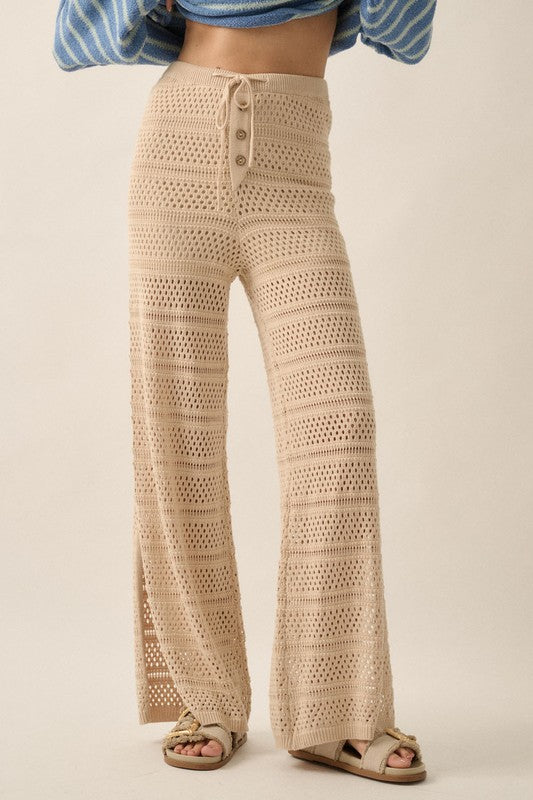 A pair of pointelle crochet-knit pants with the following features: Drawstring elastic waist. Decorative button fly with coconut wood buttons. Wide leg. Side-split hem. Partial shorts lining. Relaxed fit.