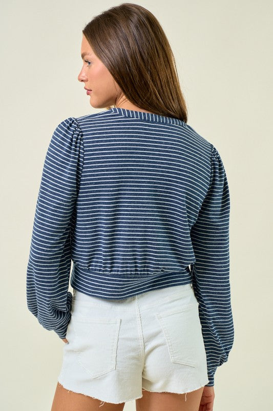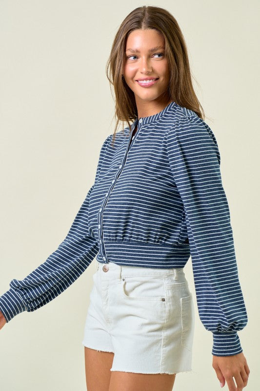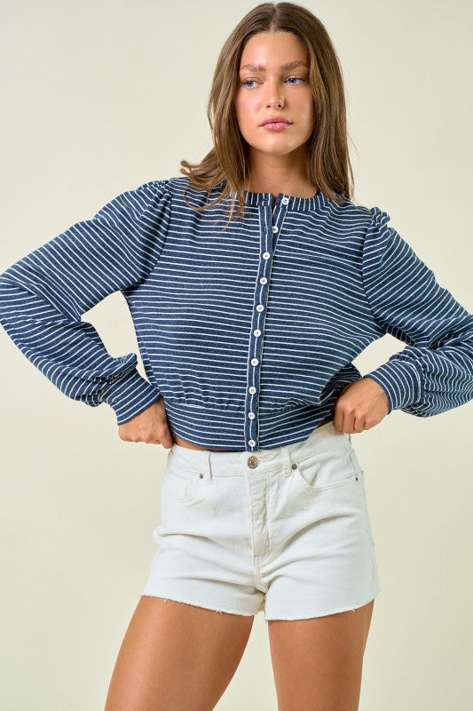 The Saylor Cardigan Top showcases timeless horizontal stripes and a button-front detail for effortless casual wear. Its blouson silhouette with softly gathered shoulders and a cinched waist creates a flattering shape that pairs beautifully with high-waisted shorts or skirts.