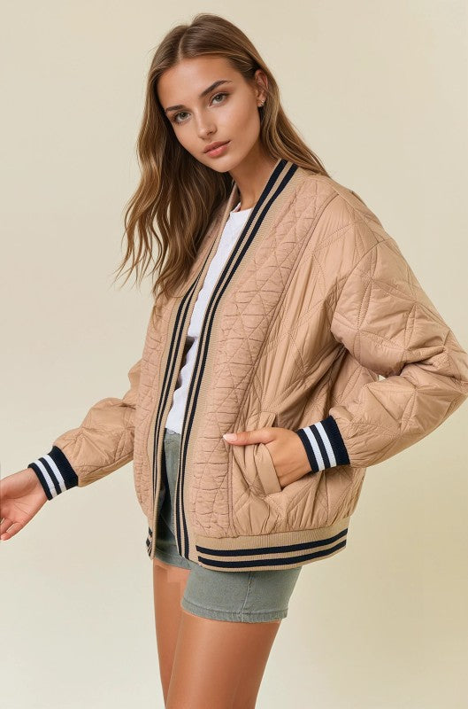 QUILTED OPEN CARDIGAN W/ SIDE SLANT POCKETS - Lightweight, padded construction for warmth without bulk - Open front design for easy layering - Convenient side slant pockets for functionality - Ribbed trim with striped detailing on cuffs and hem