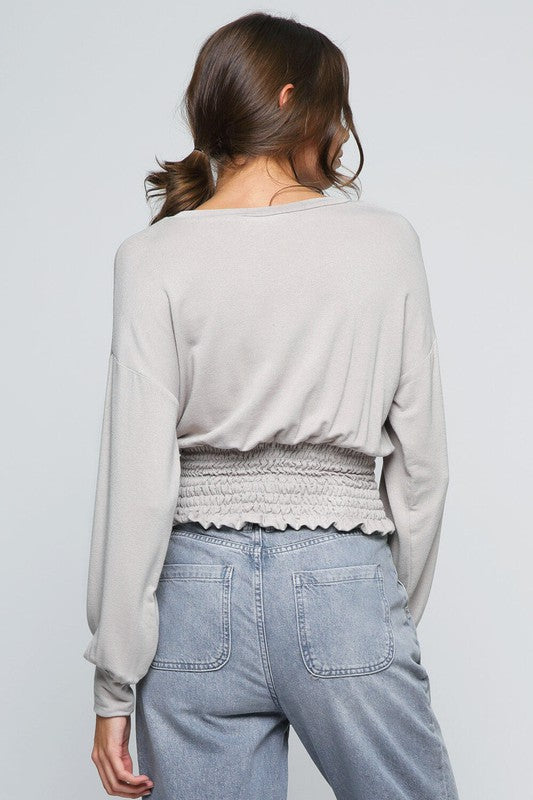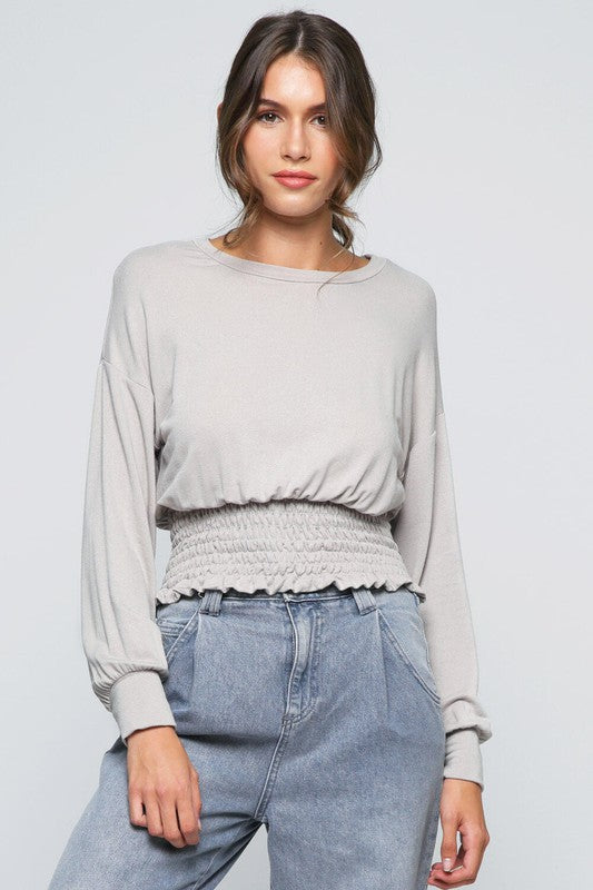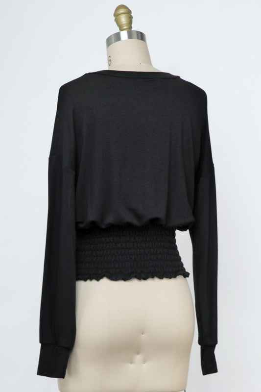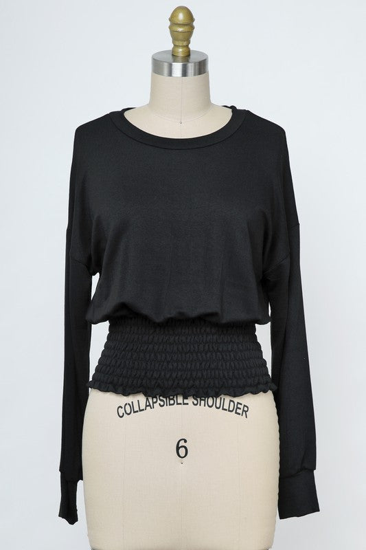 In Black, this long-sleeve top has a relaxed drop-shoulder style and a smocked waist for a great fit. Made in the USA with soft, stretchy fabric, it combines comfort and style for daily wear.