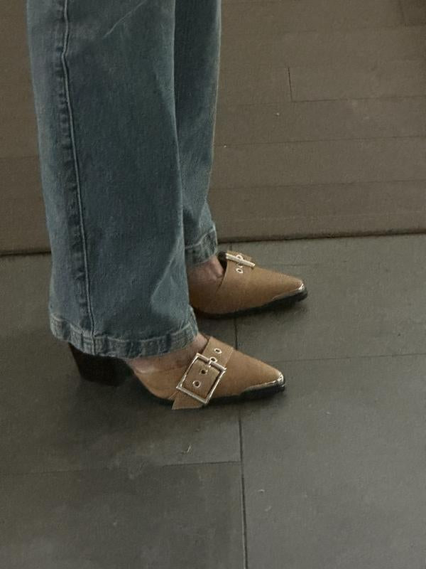 Strut your stuff in these so cool chunky heels and bootie fusion shoe. Featuring three buckled straps and a pointed toe.