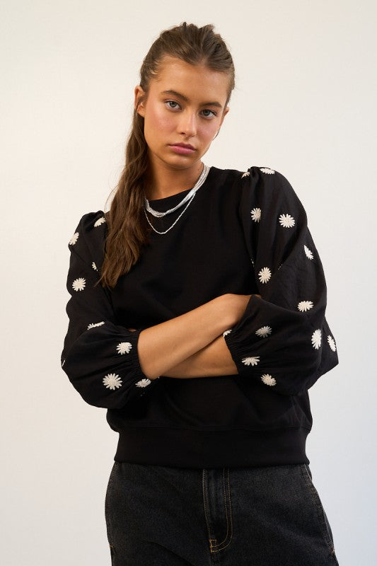 This comfortable knit top features balloon sleeves decorated with embroidered white flowers for a fresh, stylish look. Its soft cotton-blend fabric and relaxed fit make it perfect for any season and a great addition to your casual wardrobe.