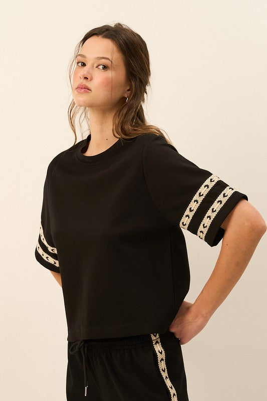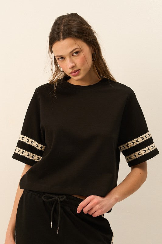 Crafted from our soft knit fabric, these short-sleeve tops are available in deep black and gentle ecru shades, featuring distinctive double-line sleeve edges. The Aztec-inspired detailing on the sleeves brings a western flair, making them an ideal match with jeans and boots for a stylish, laid-back outfit.
